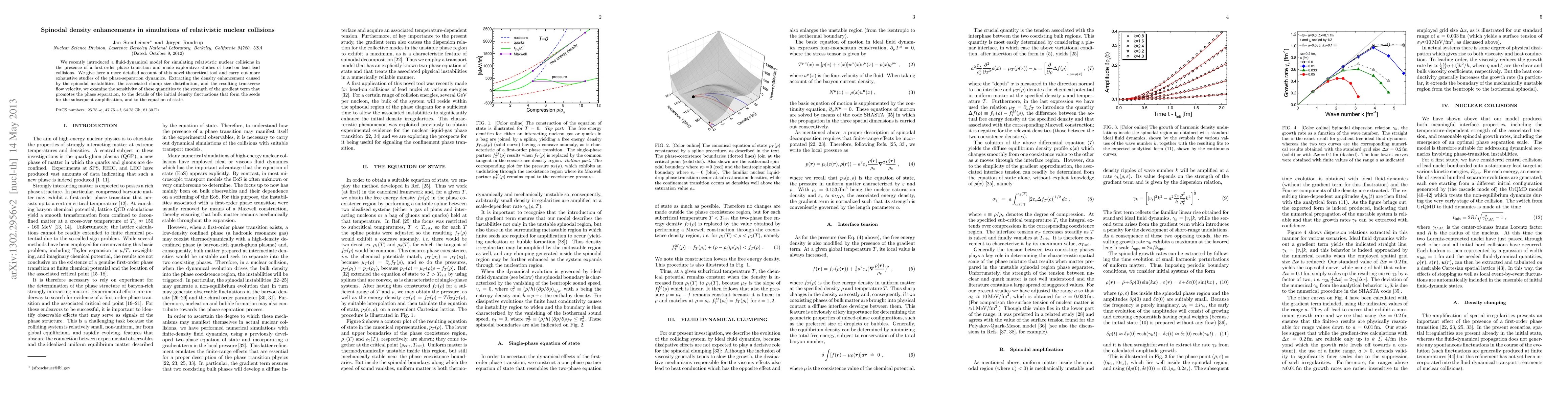 This paper presents a detailed analysis of a fluid-dynamical model for simulating relativistic nuclear collisions, focusing on the spinodal density enhancements during phase-separation dynamics. It examines the sensitivity of density enhancements, clump size distribution, and transverse flow velocity to various factors including gradient terms, initial density fluctuations, and the equation of state.