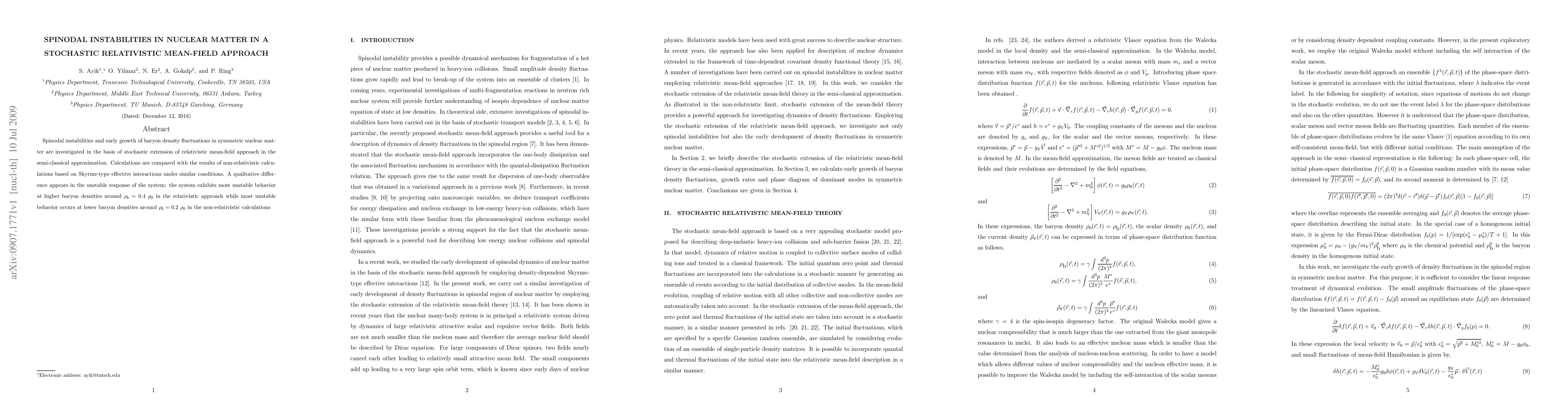 Spinodal instabilities and early growth of baryon density fluctuations in symmetric nuclear matter are investigated in the basis of stochastic extension of relativistic mean-field approach in the semi-classical approximation. Calculations are compared with the results of non-relativistic calculations based on Skyrme-type effective interactions under similar conditions. A qualitative difference appears in the unstable response of the system: the system exhibits most unstable behavior at higher baryon densities around $\rho_{b}=0.4 ~\rho_{0}$ in the relativistic approach while most unstable behavior occurs at lower baryon densities around $\rho_{b}=0.2 ~\rho_{0}$ in the non-relativistic calculations