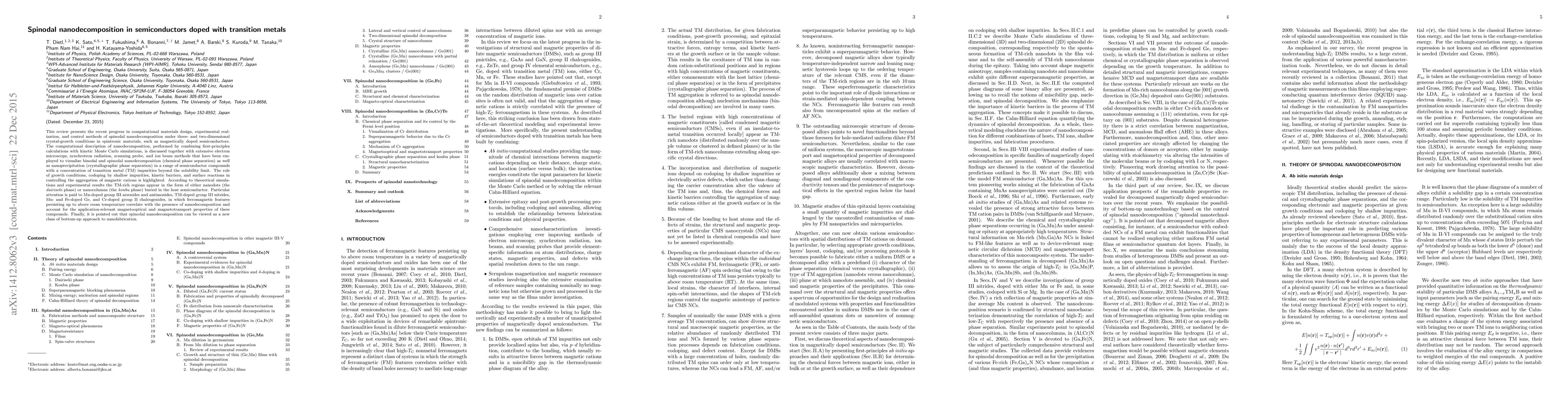 This review presents the recent progress in computational materials design, experimental realization, and control methods of spinodal nanodecomposition under three- and two-dimensional crystal-growth conditions in spintronic materials, such as magnetically doped semiconductors. The computational description of nanodecomposition, performed by combining first-principles calculations with kinetic Monte Carlo simulations, is discussed together with extensive electron microscopy, synchrotron radiation, scanning probe, and ion beam methods that have been employed to visualize binodal and spinodal nanodecomposition (chemical phase separation) as well as nanoprecipitation (crystallographic phase separation) in a range of semiconductor compounds with a concentration of transition metal (TM) impurities beyond the solubility limit. The role of growth conditions, co-doping by shallow impurities, kinetic barriers, and surface reactions in controlling the aggregation of magnetic cations is highlighted. According to theoretical simulations and experimental results the TM-rich regions appear either in the form of nanodots (the {\em dairiseki} phase) or nanocolumns (the {\em konbu} phase) buried in the host semiconductor. Particular attention is paid to Mn-doped group III arsenides and antimonides, TM-doped group III nitrides, Mn- and Fe-doped Ge, and Cr-doped group II chalcogenides, in which ferromagnetic features persisting up to above room temperature correlate with the presence of nanodecomposition and account for the application-relevant magneto-optical and magnetotransport properties of these compounds. Finally, it is pointed out that spinodal nanodecomposition can be viewed as a new class of bottom-up approach to nanofabrication.