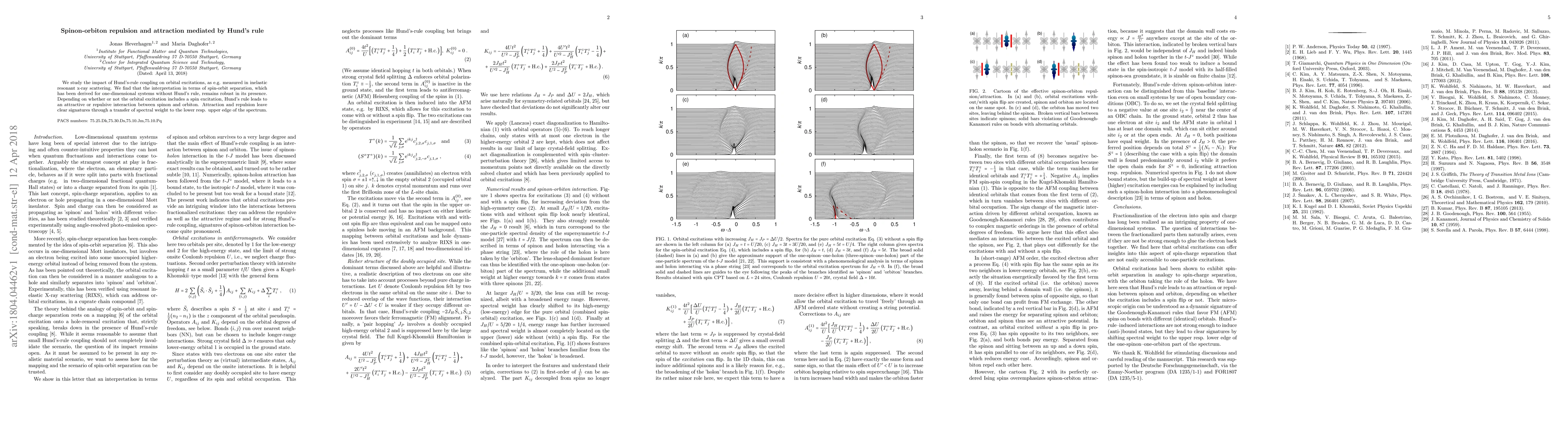 This paper investigates how Hund's-rule coupling influences orbital excitations, revealing that the interaction between spinons and orbitons can be either attractive or repulsive, depending on whether the excitation includes a spin component. These interactions manifest as shifts in spectral weight in inelastic resonant x-ray scattering.