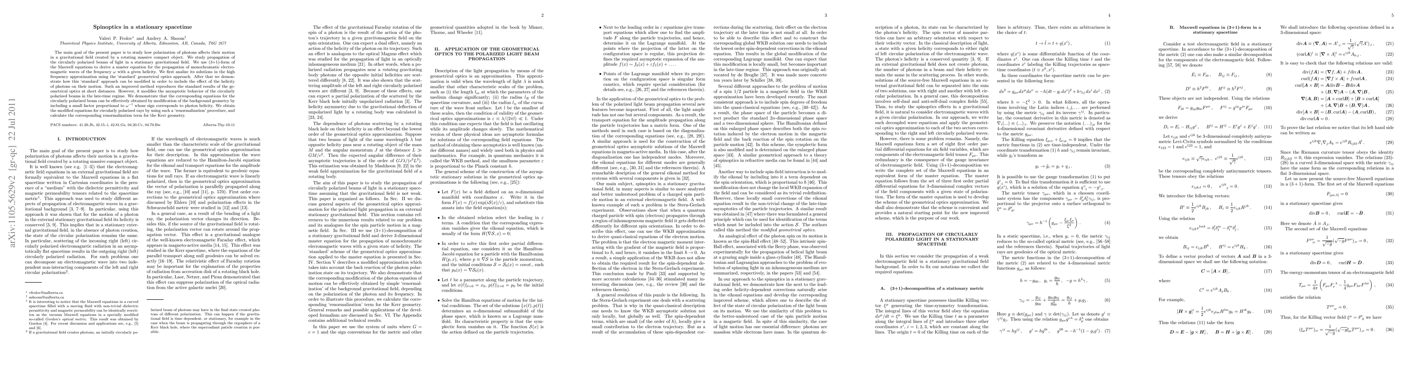 The main goal of the present paper is to study how polarization of photons affects their motion in a gravitational field created by a rotating massive compact object. We study propagation of the circularly polarized beams of light in a stationary gravitational field. We use (3+1)-form of the Maxwell equations to derive a master equation for the propagation of monochromatic electromagnetic waves of the frequency $\omega$ with a given helicity. We first analize its solutions in the high frequency approximation using the `standard' geometrical optics approach. After that we demonstrate how this `standard' approach can be modified in order to include the effect of the helicity of photons on their motion. Such an improved method reproduces the standard results of the geometrical optics at short distances. However, it modifies the asymptotic behavior of the circularly polarized beams in the late-time regime. We demonstrate that the corresponding equations for the circularly polarized beam can be effectively obtained by modification of the background geometry by including a small factor proportional to $\omega^{-1}$ whose sign corresponds to photon helicity. We obtain the modified equations for circularly polarized rays by using such a `renormalization' procedure, and calculate the corresponding renormalization term for the Kerr geometry.