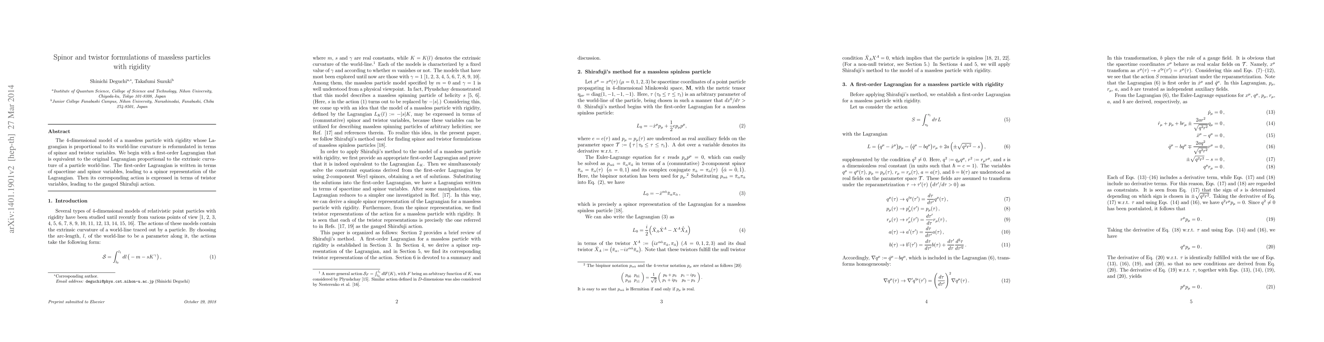 This paper reformulates a 4-dimensional massless particle model with rigidity using spinor and twistor variables, starting with a first-order Lagrangian based on world-line curvature and culminating in a gauged Shirafuji action expressed in twistor terms.