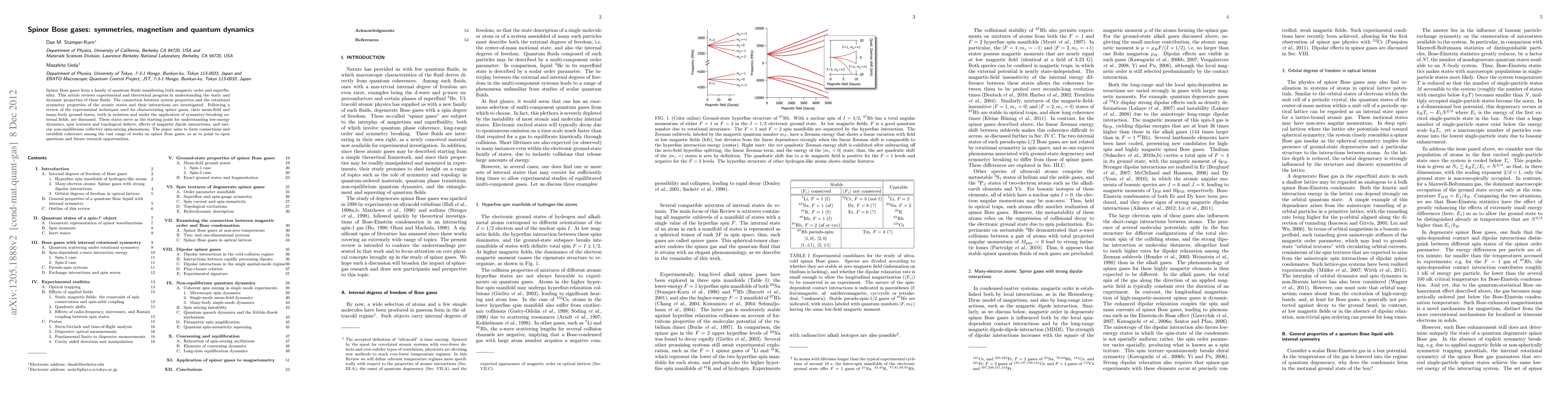 This paper reviews advancements in understanding spinor Bose gases, focusing on their magnetic order, superfluidity, and quantum dynamics. It explores the interplay between system properties and rotational symmetry, highlighting experimental techniques and theoretical models for their ground states and low-energy dynamics.