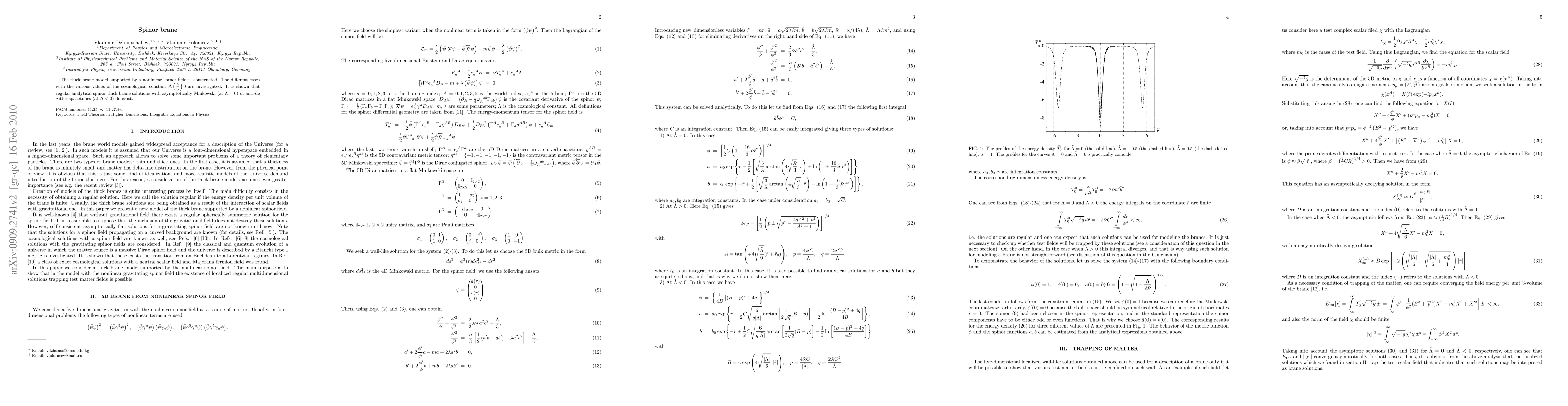 The thick brane model supported by a nonlinear spinor field is constructed. The different cases with the various values of the cosmological constant $\Lambda (< = >) 0$ are investigated. It is shown that regular analytical spinor thick brane solutions with asymptotically Minkowski (at $\Lambda=0$) or anti-de Sitter spacetimes (at $\Lambda<0$) do exist.