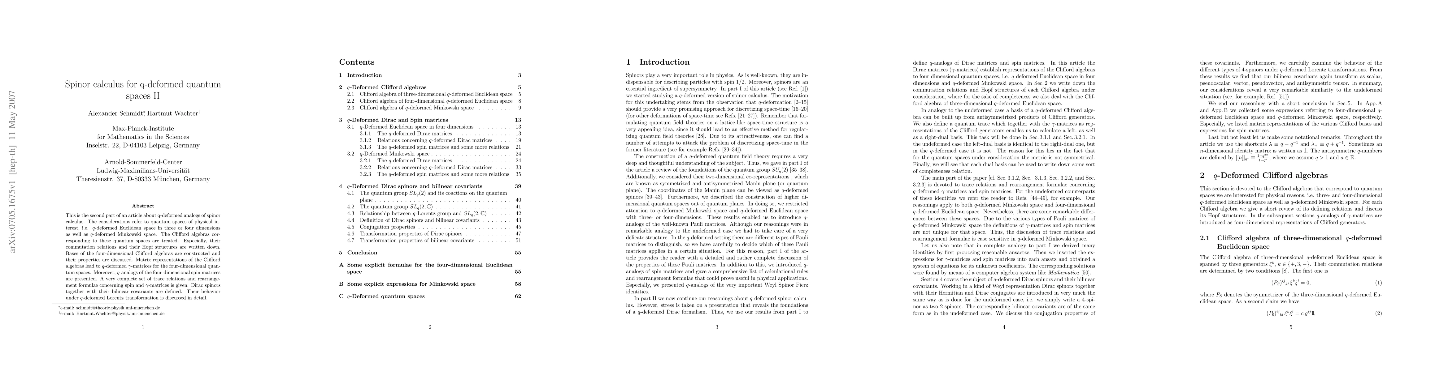 This paper extends spinor calculus to q-deformed quantum spaces, focusing on q-deformed Euclidean and Minkowski spaces. It constructs Clifford algebras and their bases, introduces q-deformed Dirac matrices, and discusses their transformation properties under q-deformed Lorentz transformations.