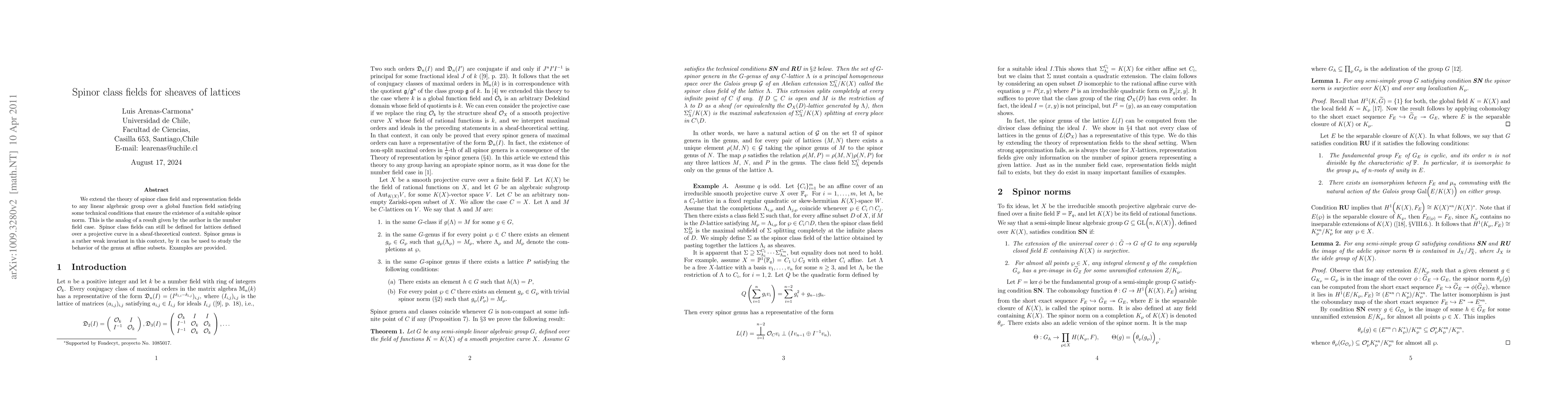We extend the theory of spinor class field and representation fields previously defined for lattices over the ring of integers of a number field to both, lattices over the coordinate ring of a smooth irreducible affine curve over a finite field, and sheaves of lattices over the structure sheaf of an irreducible smooth projective curve over a finite field.