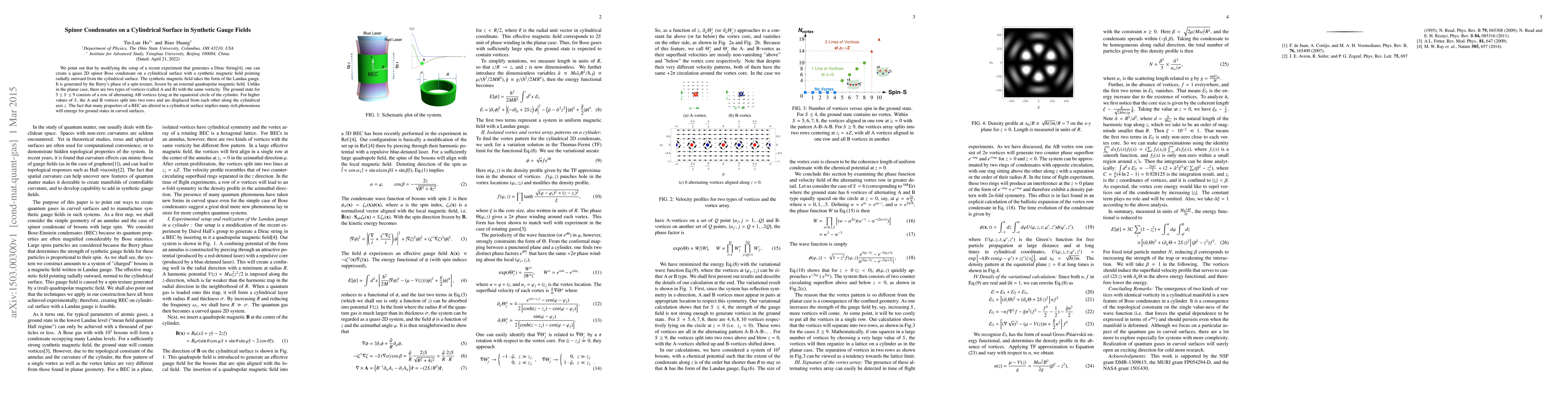 We point out that by modifying the setup of a recent experiment that generates a Dirac string, one can create a quasi 2D spinor Bose condensate on a cylindrical surface with a synthetic magnetic field pointing radially outward from the cylindrical surface. The synthetic magnetic field takes the form of the Landau gauge. It is generated by the Berry's phase of a spin texture, frozen by an external quadrupolar magnetic field. Unlike in the planar case, there are two types of vortices (called A and B) with the same vorticity. The ground state for $5\le S\le 9$ consists of a row of alternating AB vortices lying at the equatorial circle of the cylinder. For higher values of $S$, the A and B vortices split into two rows and are displaced from each other along the cylindrical axis $z$. The fact that many properties of a BEC are altered in a cylindrical surface implies many rich phenomena will emerge for ground states in curved surfaces.