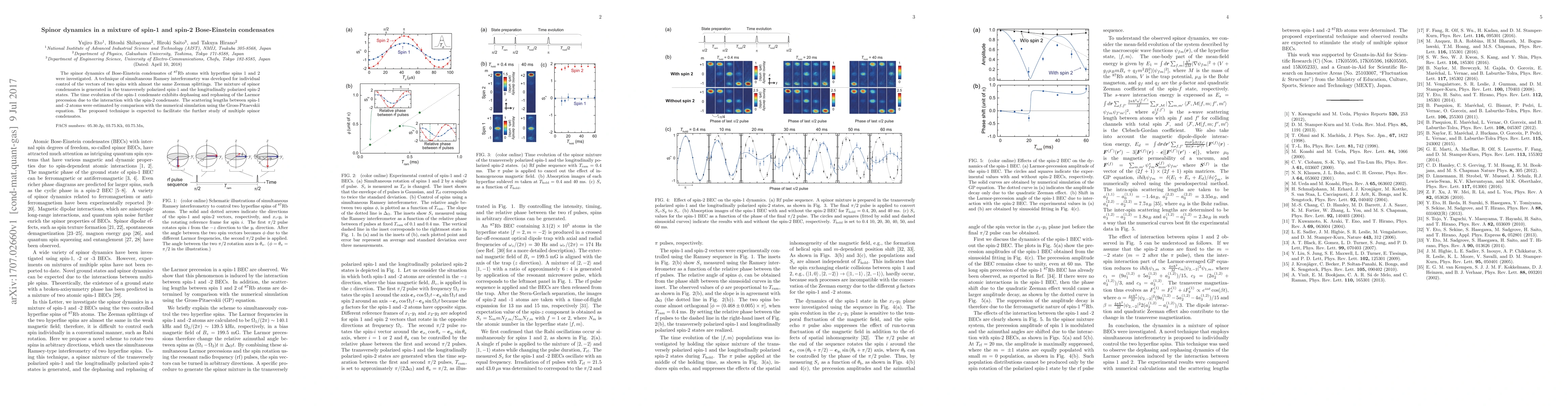 The spinor dynamics of Bose-Einstein condensates of 87Rb atoms with hyperfine spins 1 and 2 were investigated. A technique of simultaneous Ramsey interferometry was developed for individual control of the vectors of two spins with almost the same Zeeman splittings. The mixture of spinor condensates is generated in the transversely polarized spin-1 and the longitudinally polarized spin-2 states. The time evolution of the spin-1 condensate exhibits dephasing and rephasing of the Larmor precession due to the interaction with the spin-2 condensate. The scattering lengths between spin-1 and -2 atoms were estimated by comparison with the numerical simulation using the Gross-Pitaevskii equation. The proposed technique is expected to facilitate the further study of multiple spinor condensates.