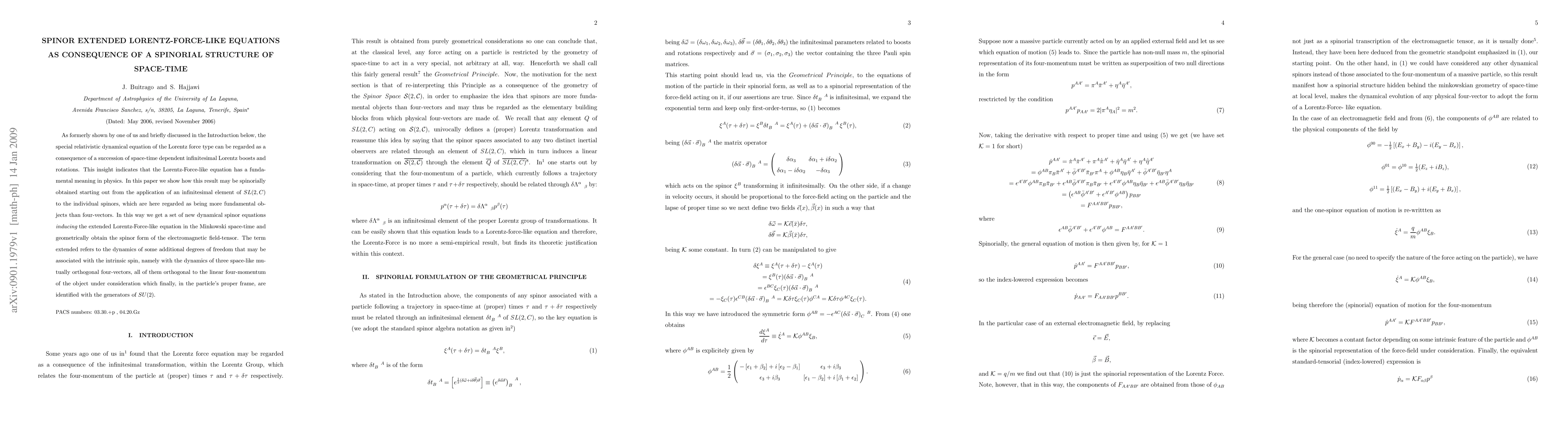 As previously shown, the special relativistic dynamical equation of the Lorentz force type can be regarded as a consequence of a succession of space-time dependent infinitesimal Lorentz boosts and rotations. This insight indicate that the Lorentz-Force-like equation has a fundamental meaning in physics. We show how this result may be spinorially obtained starting out out from the application of an infinitesimal element of SL(2,C) to the individual spinors, which are regarded here as being more fundamental objects than four-vectors. In this way we get a set of new dynamical spinor equations inducing the extended Lorentz-Force-like equation in the Minkowski space-time and geometrically obtain the spinor form of the electromagnetic field tensor. The term extended refers to the dynamics of some additional degrees of freedom that may be associated with the intrinsic spin, namely, with the dynamics of three spacelike mutually orthogonal four-vectors, all of them orthogonal to the linear four-momentum of the object under consideration that finally, in the particle's proper frame. are identified with the generators of SU(2).