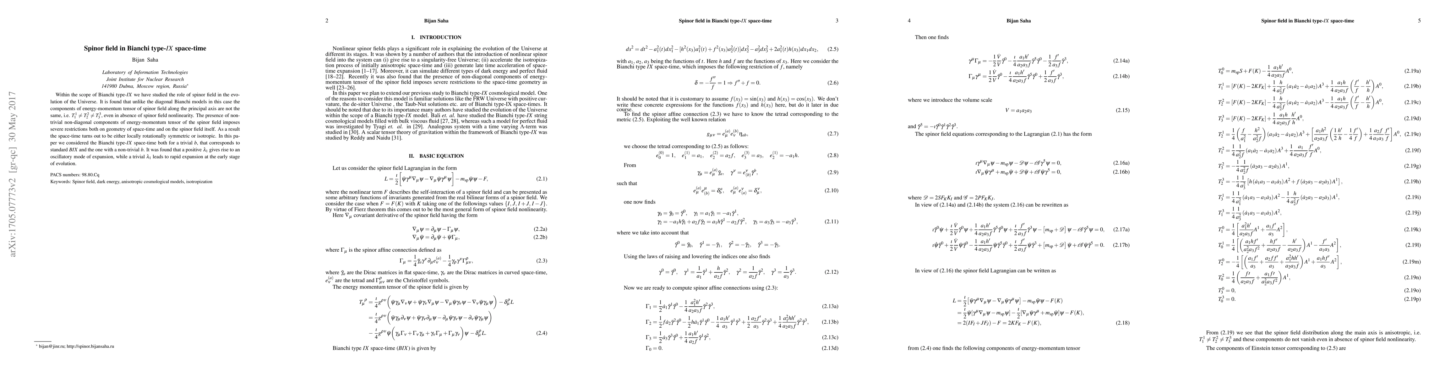 This paper investigates the influence of spinor fields in Bianchi type-$IX$ space-time, revealing that non-diagonal components of the energy-momentum tensor lead to either local rotational symmetry or isotropy. A positive $\lambda_1$ results in oscillatory expansion, while a trivial $\lambda_1$ causes rapid early-stage expansion.