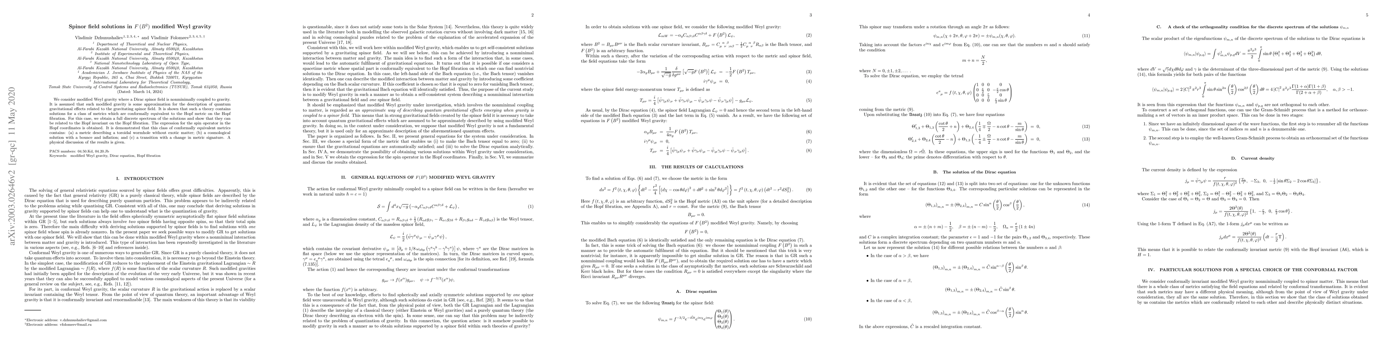 We consider modified Weyl gravity where a Dirac spinor field is nonminimally coupled to gravity. It is assumed that such modified gravity is some approximation for the description of quantum gravitational effects related to the gravitating spinor field. It is shown that such a theory contains solutions for a class of metrics which are conformally equivalent to the Hopf metric on the Hopf fibration. For this case, we obtain a full discrete spectrum of the solutions and show that they can be related to the Hopf invariant on the Hopf fibration. The expression for the spin operator in the Hopf coordinates is obtained. It is demonstrated that this class of conformally equivalent metrics contains: (a) a metric describing a toroidal wormhole without exotic matter; (b) a cosmological solution with a bounce and inflation; and (c) a transition with a change in metric signature. A physical discussion of the results is given. \end{abstract}