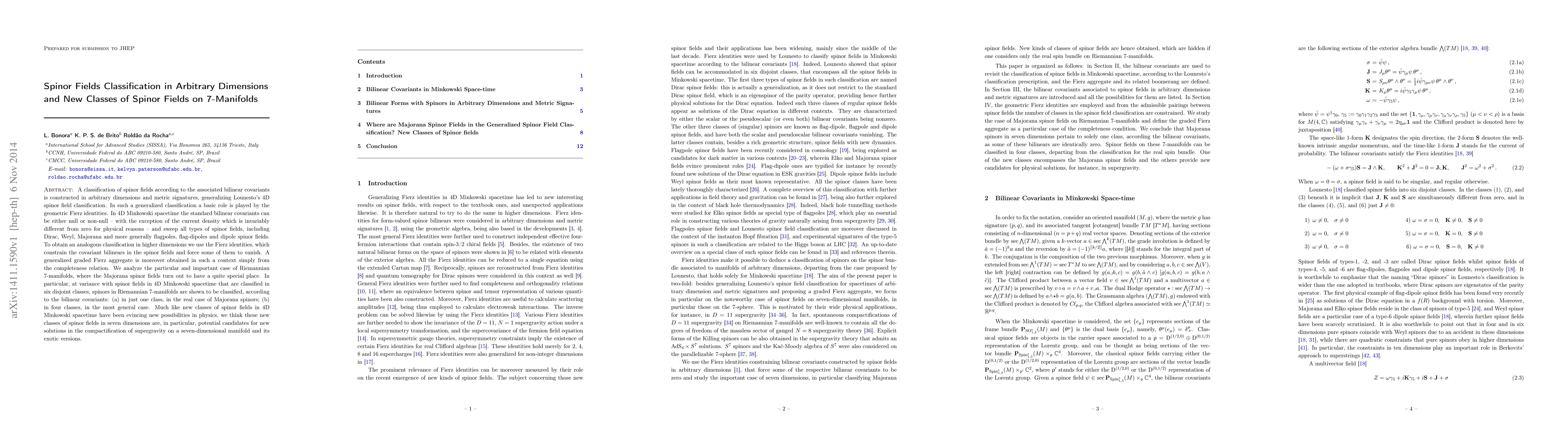 This paper classifies spinor fields in arbitrary dimensions using geometric Fierz identities, generalizing previous 4D classifications. It reveals that Majorana spinors in Riemannian 7-manifolds are uniquely classified in one class, contrasting with the six classes in 4D Minkowski spacetime, and suggests these new classes may offer insights into the compactification of supergravity on seven-dimensional manifolds.