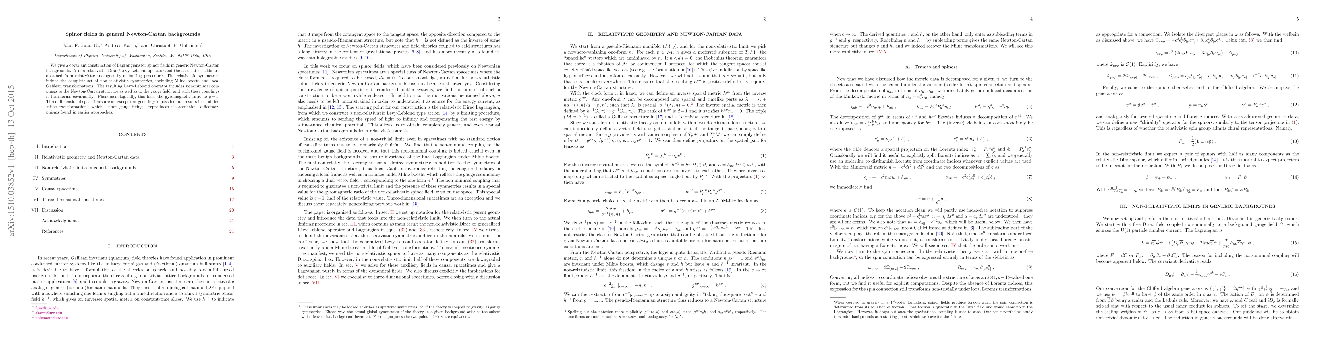 We give a covariant construction of Lagrangians for spinor fields in generic Newton-Cartan backgrounds. A non-relativistic Dirac/Levy-Leblond operator and the associated fields are obtained from relativistic analogues by a limiting procedure. The relativistic symmetries induce the complete set of non-relativistic symmetries, including Milne boosts and local Galilean transformations. The resulting Levy-Leblond operator includes non-minimal couplings to the Newton-Cartan structure as well as to the gauge field, and with these couplings it transforms covariantly. Phenomenologically, this fixes the gyromagnetic ratio to g=1. Three-dimensional spacetimes are an exception: generic g is possible but results in modified Milne transformations, which - upon gauge fixing - reproduces the anomalous diffeomorphisms found in earlier approaches.