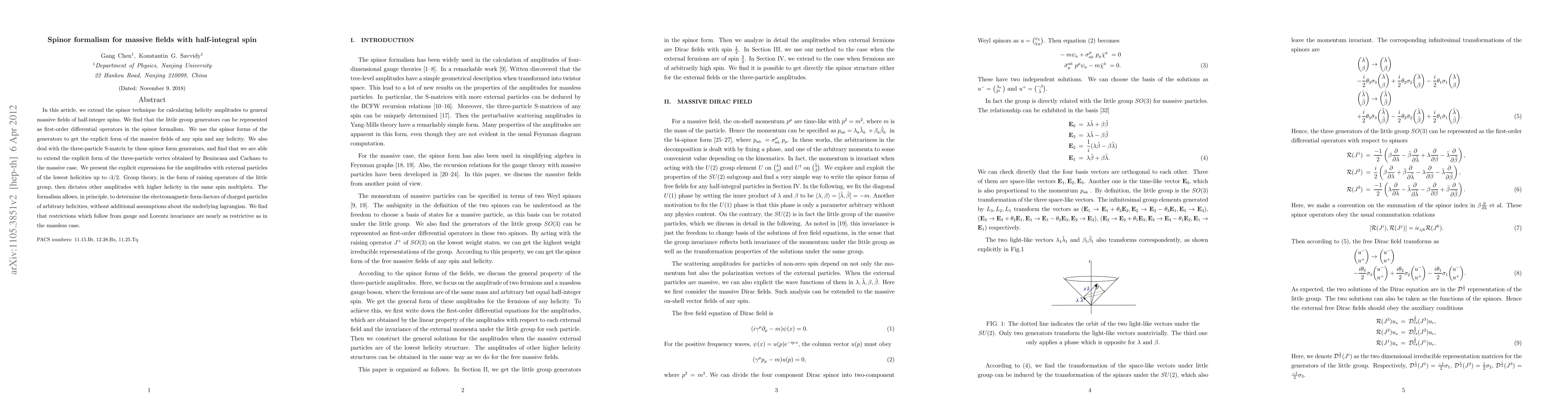 In this article, we extend the %Weyl-van der Waerden spinor technique for calculating helicity amplitudes to general massive fields of half-integer spins. We find that the little group generators can be represented as first-order differential operators in the spinor formalism. We use the spinor forms of the generators to get the explicit form of the massive fields of any spin and any helicity. We also deal with the three-particle S-matrix by these spinor form generators, and find that we are able to extend the explicit form of the three-particle vertex obtained by Benincasa and Cachazo to the massive case. We present the explicit expressions for the amplitudes with external particles of the lowest helicities up to -3/2. Group theory, in the form of raising operators of the little group, then dictates other amplitudes with higher helicity in the same spin multiplets. The formalism allows, in principle, to determine the electromagnetic form-factors of charged particles of arbitrary helicities, without additional assumptions about the underlying lagrangian. We find that restrictions which follow from gauge and Lorentz invariance are nearly as restrictive as in the massless case.