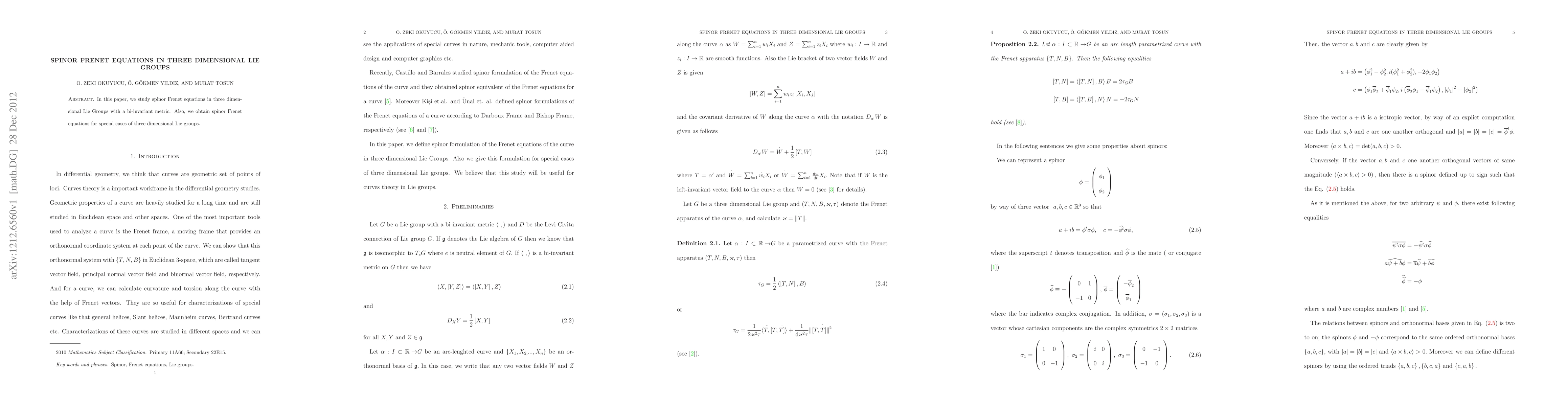 Summary: This paper investigates spinor Frenet equations within three-dimensional Lie groups equipped with a bi-invariant metric and derives these equations for specific instances of such groups.