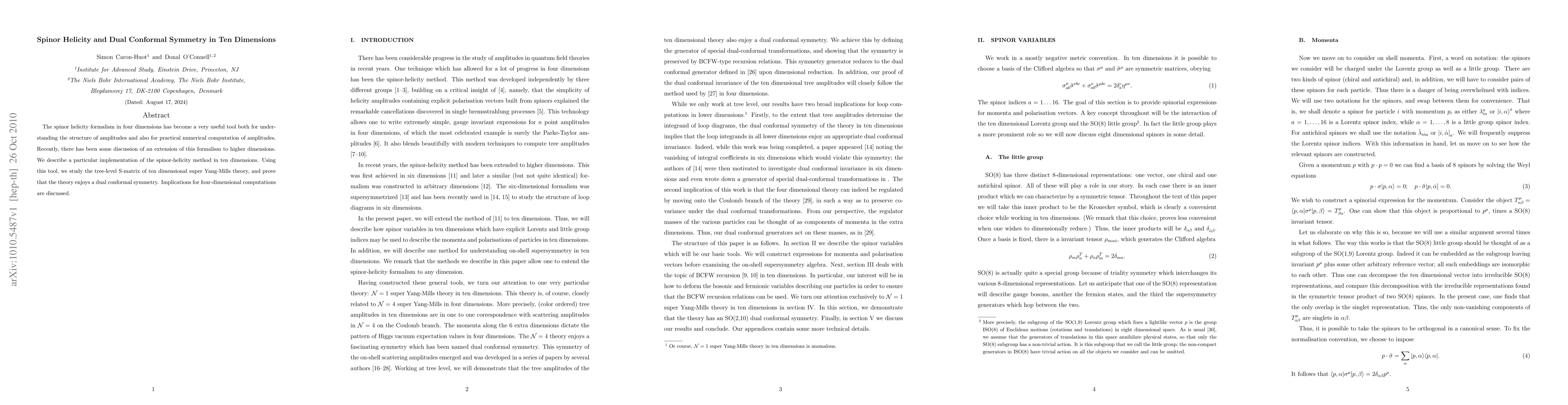 This paper extends the spinor helicity formalism to ten dimensions, applying it to the tree-level S-matrix of ten-dimensional super Yang-Mills theory. It demonstrates the theory's dual conformal symmetry and discusses potential implications for four-dimensional computations.