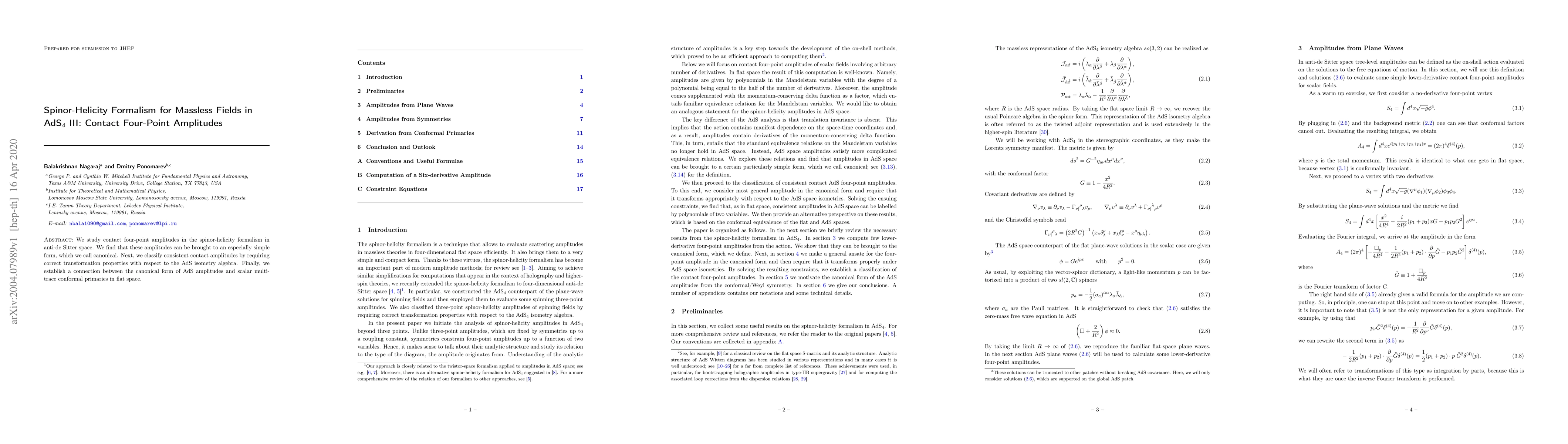 This paper explores contact four-point amplitudes in the spinor-helicity formalism within AdS$_4$ space, deriving a canonical form for these amplitudes. The study also classifies these amplitudes based on their transformation properties under the AdS isometry algebra and links the canonical form to scalar multi-trace conformal primaries in flat space.