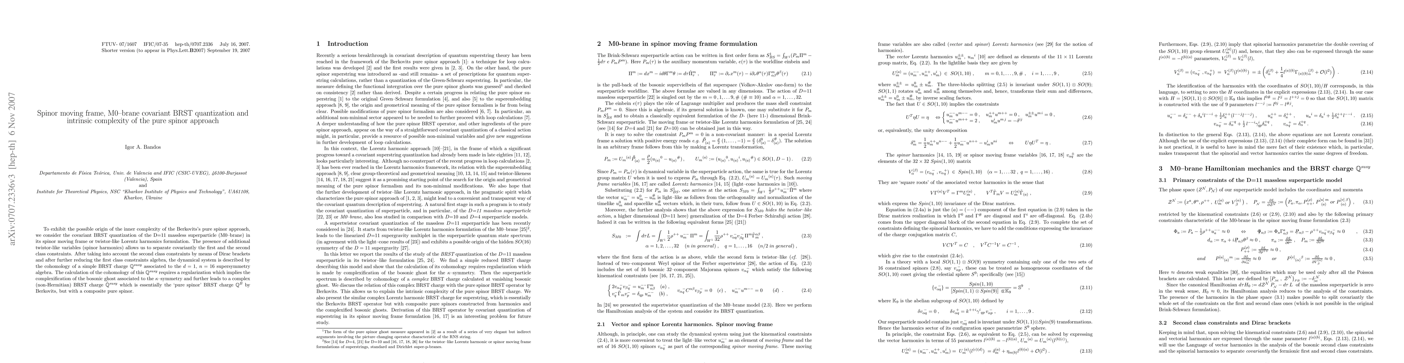 This research explores the covariant BRST quantization of the D=11 massless superparticle (M0-brane) within a spinor moving frame, revealing the intrinsic complexity of Berkovits's pure spinor approach through the introduction of additional twistor-like variables. The study leads to a complex (non-Hermitian) BRST charge, which corresponds to Berkovits's pure spinor BRST operator but with a composite pure spinor.