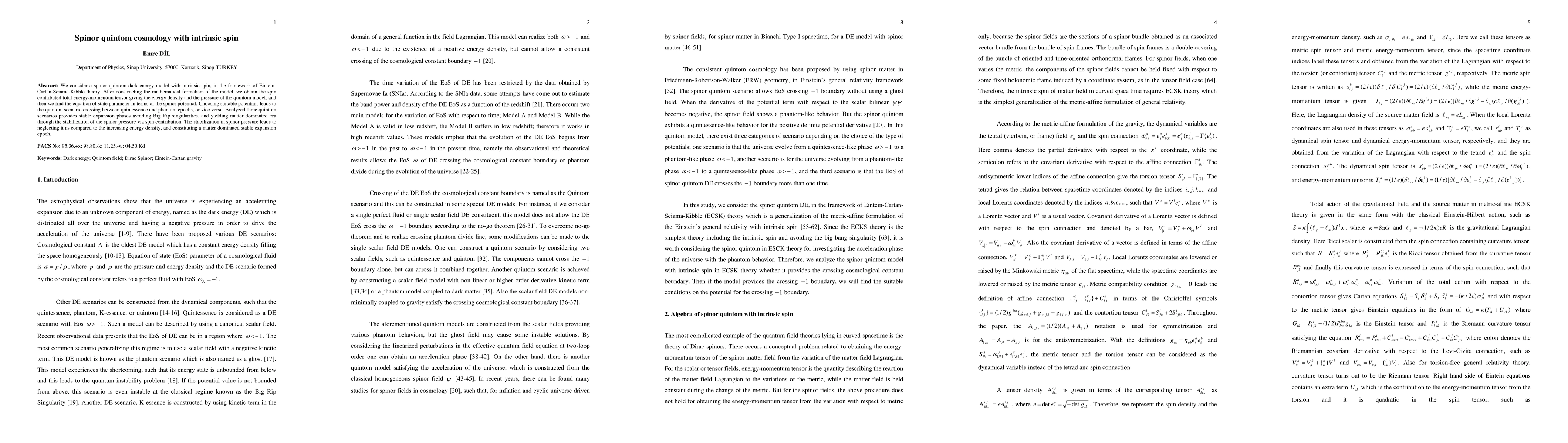 This paper explores a spinor quintom dark energy model incorporating intrinsic spin within the Einstein-Cartan-Sciama-Kibble theory. It derives the energy density and pressure of the quintom model, revealing a scenario where the quintom can transition between quintessence and phantom phases, leading to stable expansion phases that avoid Big Rip singularities and transition to a matter-dominated era.