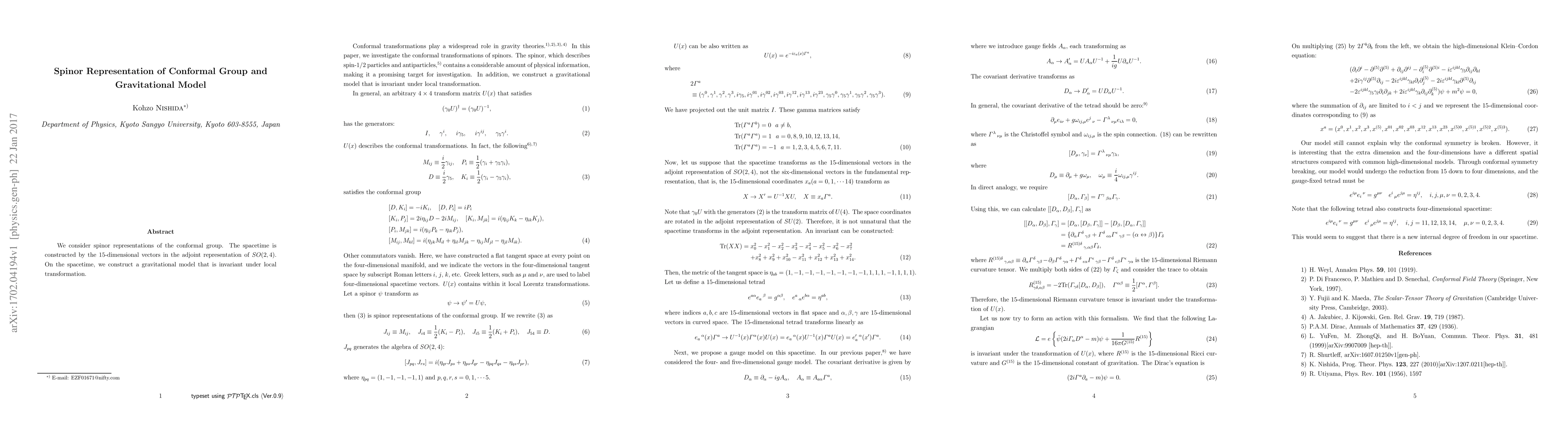We consider spinor representations of the conformal group. The spacetime is constructed by the 15-dimensional vectors in the adjoint representation of $SO(2,4)$. On the spacetime, we construct a gravitational model that is invariant under local transformation.