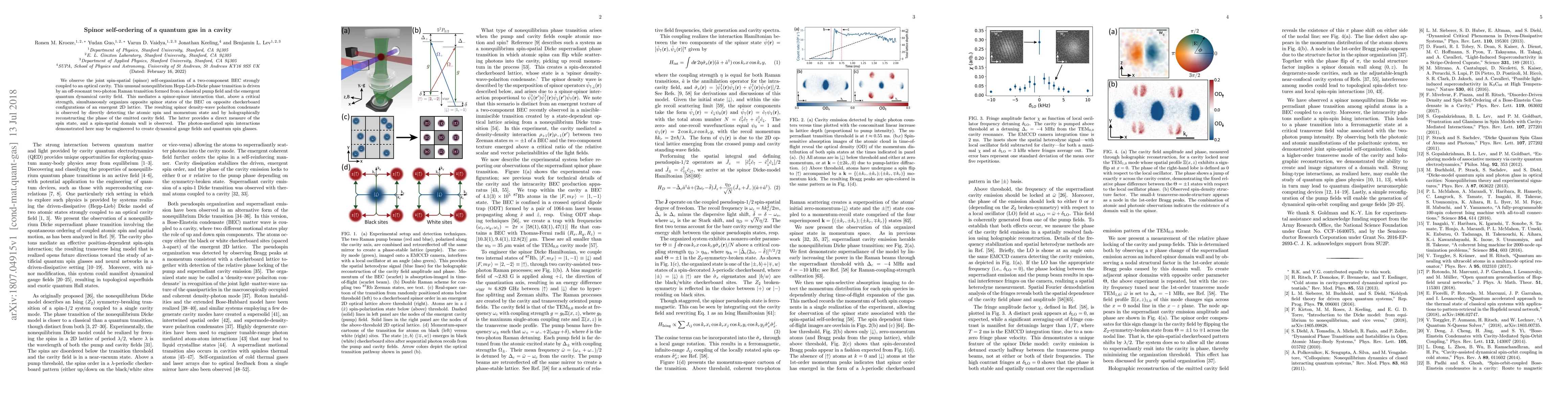 We observe the joint spin-spatial (spinor) self-organization of a two-component BEC strongly coupled to an optical cavity. This unusual nonequilibrium Hepp-Lieb-Dicke phase transition is driven by an off-resonant two-photon Raman transition formed from a classical pump field and the emergent quantum dynamical cavity field. This mediates a spinor-spinor interaction that, above a critical strength, simultaneously organizes opposite spinor states of the BEC on opposite checkerboard configurations of an emergent 2D lattice. The resulting spinor density-wave polariton condensate is observed by directly detecting the atomic spin and momentum state and by holographically reconstructing the phase of the emitted cavity field. The latter provides a direct measure of the spin state, and a spin-spatial domain wall is observed. The photon-mediated spin interactions demonstrated here may be engineered to create dynamical gauge fields and quantum spin glasses.