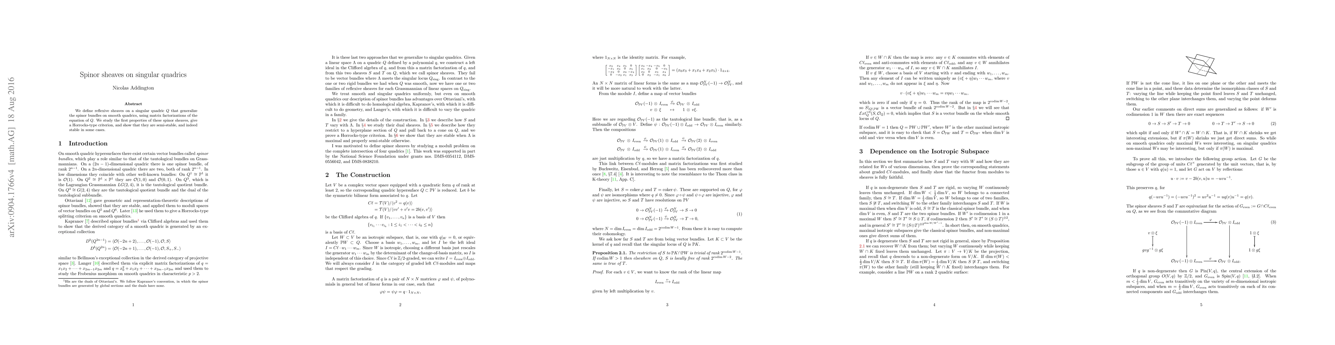 This paper introduces spinor sheaves on singular quadrics, generalizing spinorial structures from smooth quadrics via matrix factorizations. The authors establish Horrocks-type criteria and demonstrate semi-stability, with stability in specific cases.