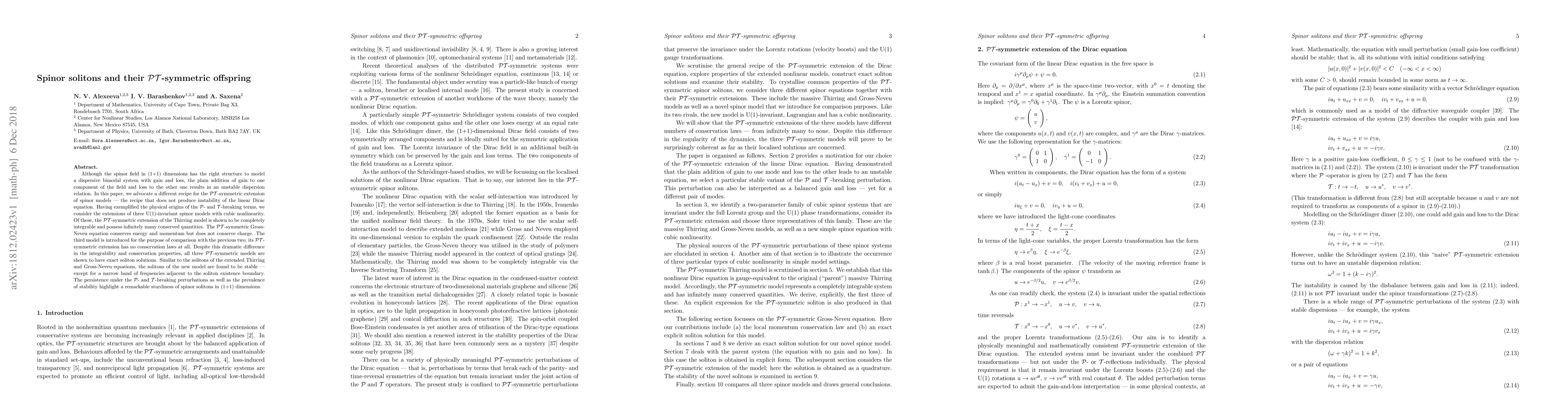 The paper derives explicit soliton solutions for novel and extended spinor models, demonstrating their stability under PT-symmetric perturbations, and establishes conservation laws for these models.