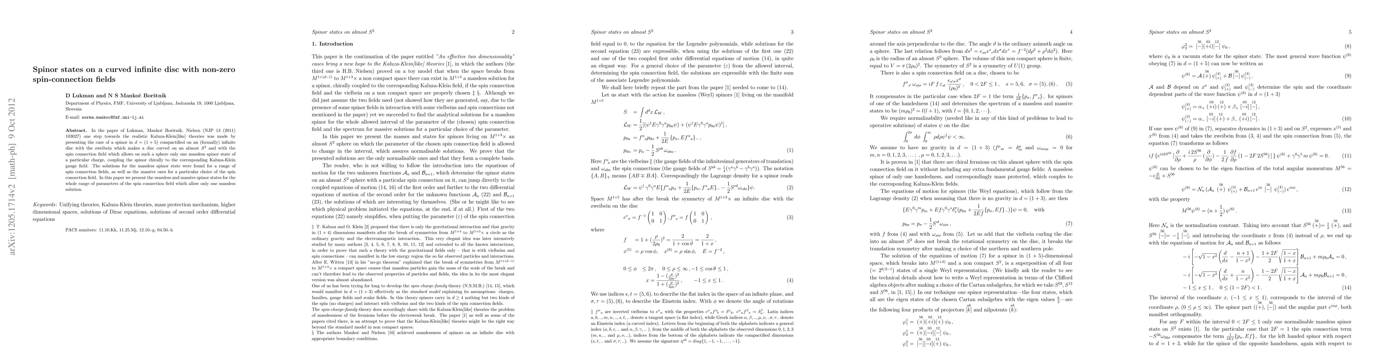 In the paper of Lukman, Mankoc Borstnik, Nielsen (NJP 13 (2011) 103027) one step towards the realistic Kaluza-Klein[like] theories was made by presenting the case of a spinor in $d=(1+5)$ compactified on an (formally) infinite disc with the zweibein which makes a disc curved on an almost $S^2$ and with the spin connection field which allows on such a sphere only one massless spinor state of a particular charge, coupling the spinor chirally to the corresponding Kaluza-Klein gauge field. The solutions for the massless spinor state were found for a range of spin connection fields, as well as the massive ones for a particular choice of the spin connection field. In this paper we present the massless and massive spinor states for the whole range of parameters of the spin connection field, which allow only one massless solution.