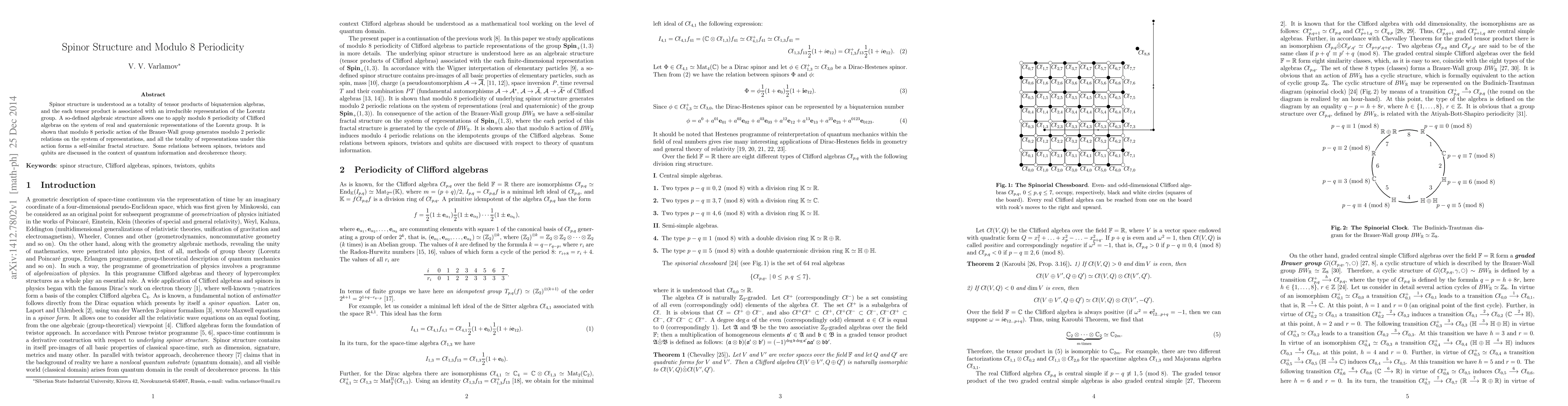 Spinor structure is understood as a totality of tensor products of biquaternion algebras, and the each tensor product is associated with an irreducible representation of the Lorentz group. A so-defined algebraic structure allows one to apply modulo 8 periodicity of Clifford algebras on the system of real and quaternionic representations of the Lorentz group. It is shown that modulo 8 periodic action of the Brauer-Wall group generates modulo 2 periodic relations on the system of representations, and all the totality of representations under this action forms a self-similar fractal structure. Some relations between spinors, twistors and qubits are discussed in the context of quantum information and decoherence theory.