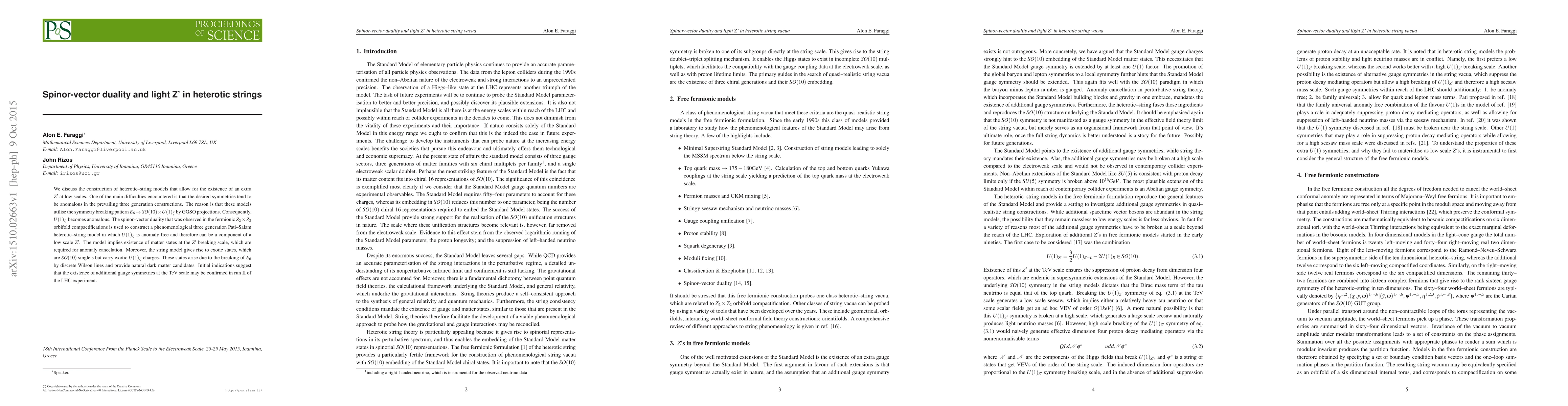 We discuss the construction of heterotic--string models that allow for the existence of an extra $Z^\prime$ at low scales. One of the main difficulties encountered is that the desired symmetries tend to be anomalous in the prevailing three generation constructions. The reason is that these models utilise the symmetry breaking pattern $E_6\rightarrow SO(10)\times U(1)_\zeta$ by GGSO projections. Consequently, $U(1)_\zeta$ becomes anomalous. The spinor--vector duality that was observed in the fermionic $Z_2\times Z_2$ orbifold compactifications is used to construct a phenomenological three generation Pati--Salam heterotic--string model in which $U(1)_\zeta$ is anomaly free and therefore can be a component of a low scale $Z^\prime$. The model implies existence of matter states at the $Z^\prime$ breaking scale, which are required for anomaly cancelation. Moreover, the string model gives rise to exotic states, which are $SO(10)$ singlets but carry exotic $U(1)_\zeta$ charges. These states arise due to the breaking of $E_6$ by discrete Wilson lines and provide natural dark matter candidates. Initial indications suggest that the existence of additional gauge symmetries at the TeV scale may be confirmed in run II of the LHC experiment.