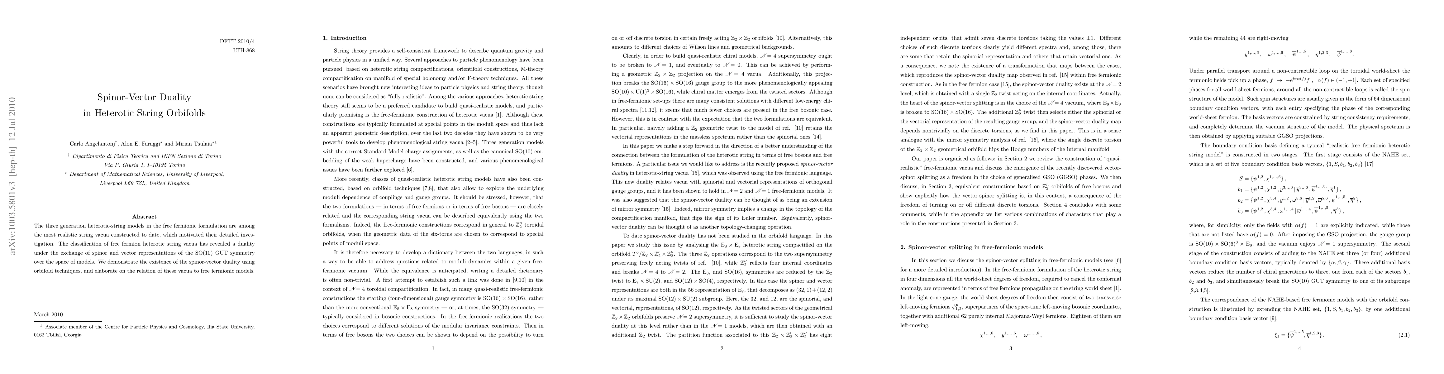 This paper investigates three-generation heterotic string vacua, revealing a spinor-vector duality via SO(10) GUT symmetry. The authors utilize orbifold techniques to demonstrate this duality and its implications for free fermionic models.