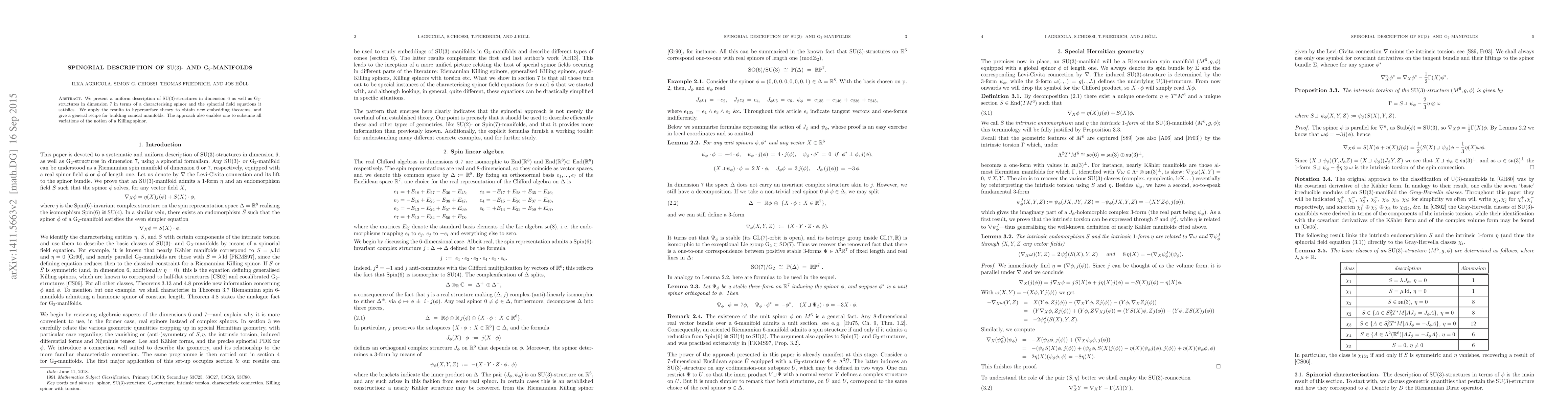 This paper provides a unified description of $\mathrm{SU}(3)$-structures and $G_2$-structures using spinors and their associated field equations, leading to new embedding theorems and methods for constructing conical manifolds. The approach also generalizes the concept of Killing spinors.