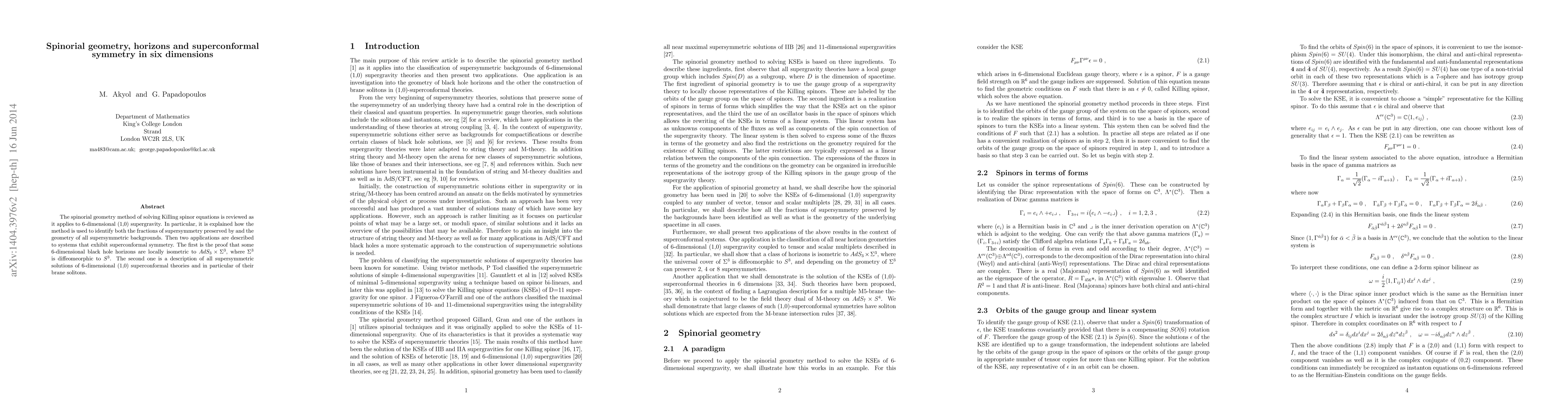 The spinorial geometry method of solving Killing spinor equations is reviewed as it applies to 6-dimensional (1,0) supergravity. In particular, it is explained how the method is used to identify both the fractions of supersymmetry preserved by and the geometry of all supersymmetric backgrounds. Then two applications are described to systems that exhibit superconformal symmetry. The first is the proof that some 6-dimensional black hole horizons are locally isometric to $AdS_3\times \Sigma^3$, where $\Sigma^3$ is diffeomeorphic to $S^3$. The second one is a description of all supersymmetric solutions of 6-dimensional (1,0) superconformal theories and in particular of their brane solitons.