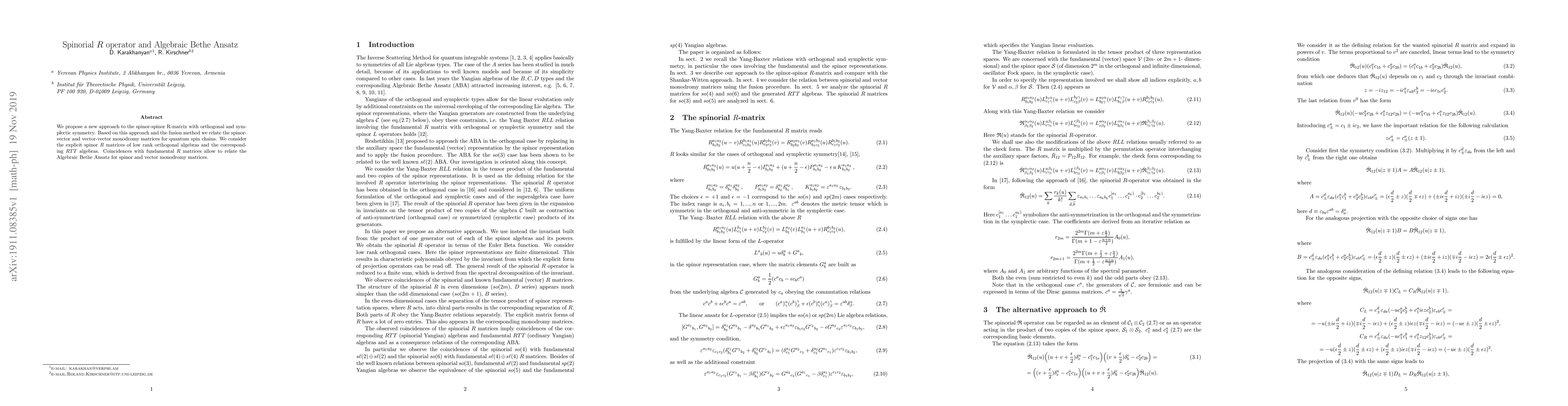We propose a new approach to the spinor-spinor R-matrix with orthogonal and symplectic symmetry. Based on this approach and the fusion method we relate the spinor-vector and vector-vector monodromy matrices for quantum spin chains. We consider the explicit spinor R matrices of low rank orthogonal algebras and the corresponding RTT algebras. Coincidences with fundamental R matrices allow to relate the Algebraic Bethe Ansatz for spinor and vector monodromy matrices.