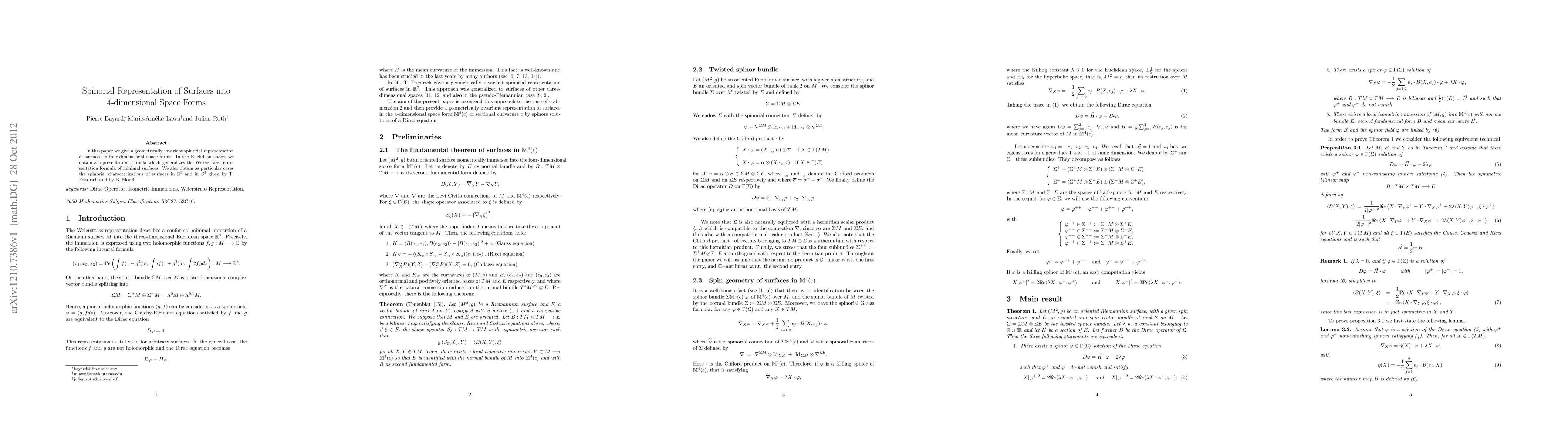 This paper presents a spinorial representation of surfaces in four-dimensional space forms, generalizing the Weierstrass representation for minimal surfaces in Euclidean space. It also derives spinorial characterizations for surfaces in $\R^3$ and $S^3$ as special cases.
