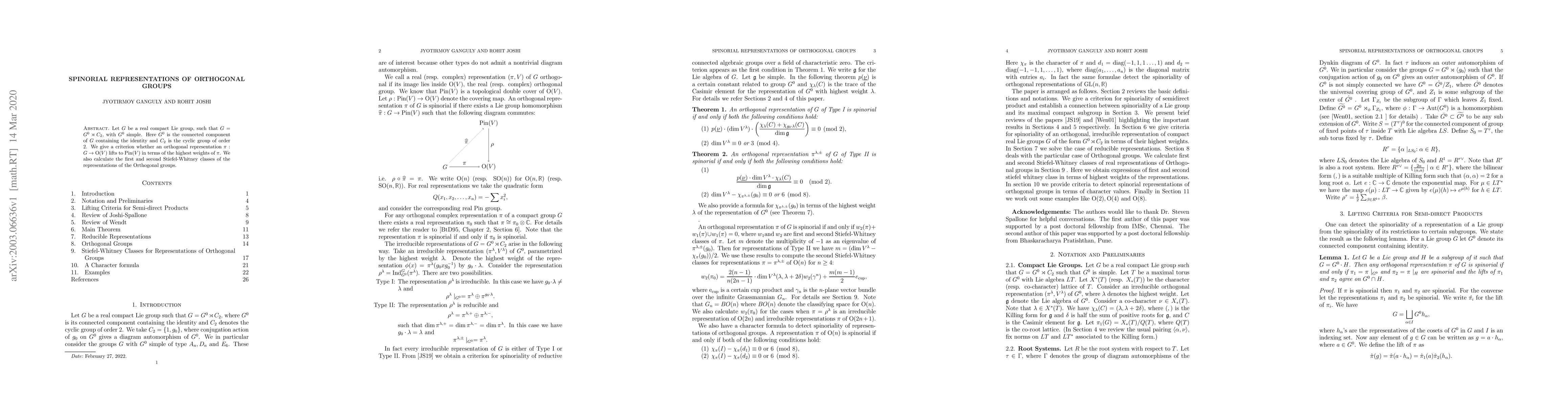 Let $G$ be a real compact Lie group, such that $G=G^0\rtimes C_2$, with $G^0$ simple. Here $G^0$ is the connected component of $G$ containing the identity and $C_2$ is the cyclic group of order $2$. We give a criterion for whether an orthogonal representation $\pi: G \to \mathrm{O}(V)$ lifts to $\mathrm{Pin}(V)$ in terms of the highest weights of $\pi$. We also calculate the first and second Stiefel-Whitney classes of the representations of the Orthogonal groups.