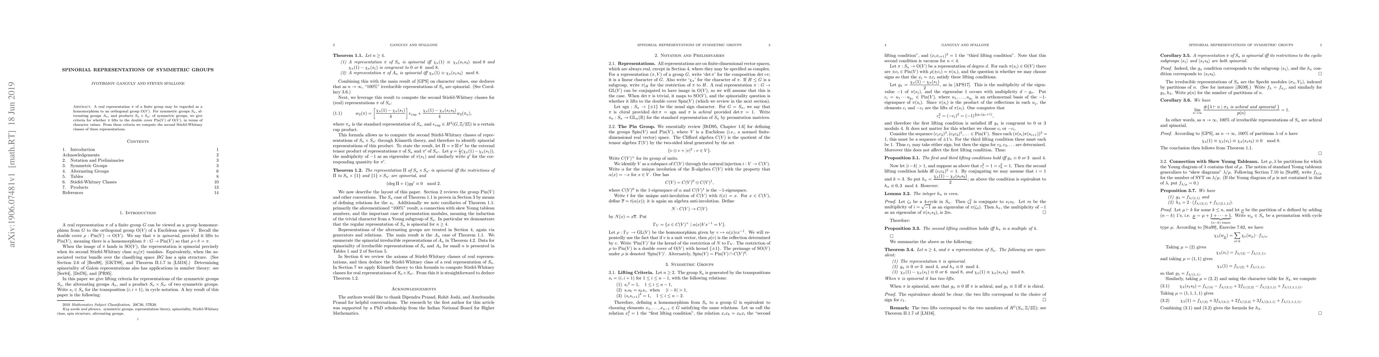 A real representation $\pi$ of a finite group may be regarded as a homomorphism to an orthogonal group $\Or(V)$. For symmetric groups $S_n$, alternating groups $A_n$, and products $S_n \times S_{n'}$ of symmetric groups, we give criteria for whether $\pi$ lifts to the double cover $\Pin(V)$ of $\Or(V)$, in terms of character values. From these criteria, we compute the second Stiefel-Whitney classes of these representations.