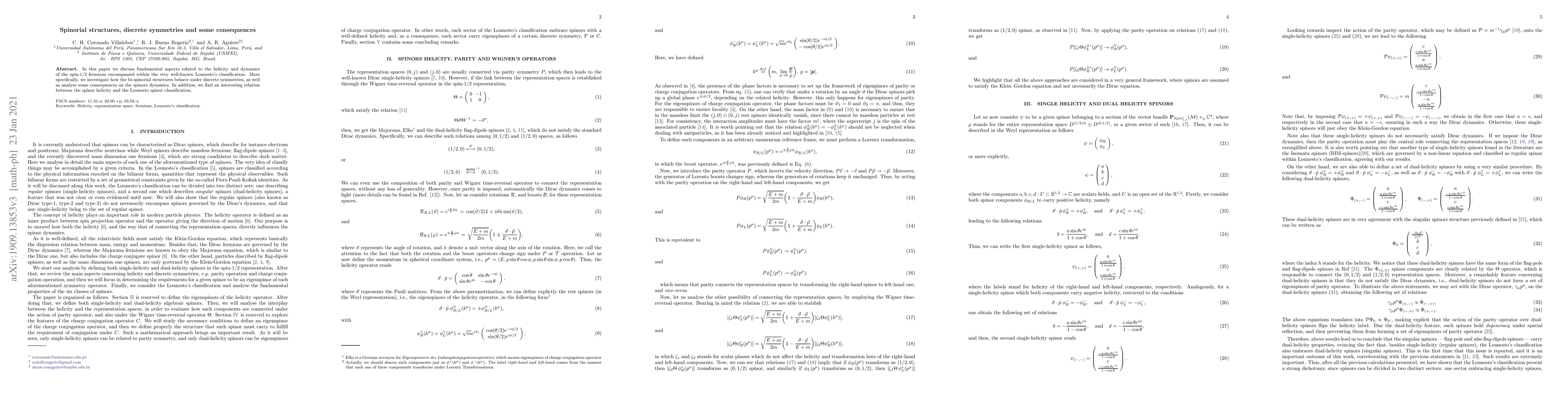 The paper explores spinorial structures, discrete symmetries, and their consequences within the Lounesto's classification for spin-1/2 fermions, analyzing bi-spinorial structures under discrete symmetries and their implications on spinor dynamics.