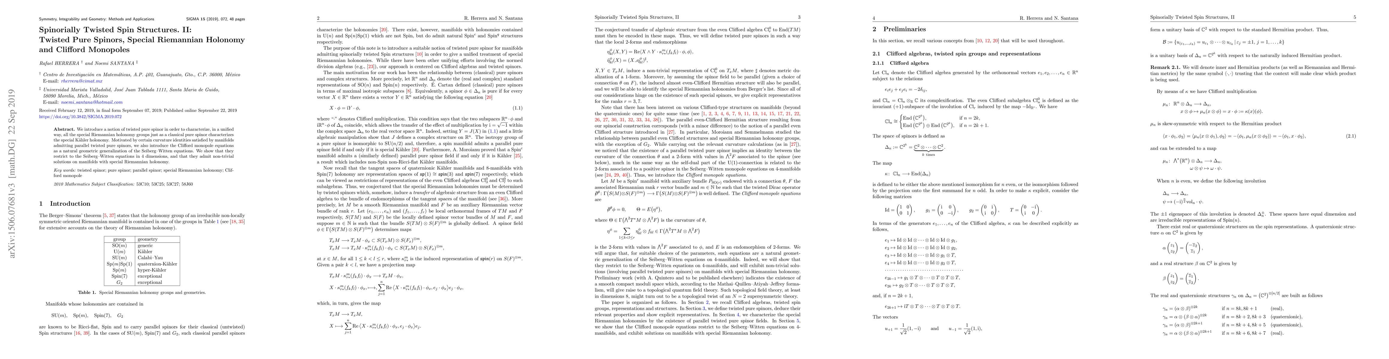 This paper introduces twisted pure spinors to characterize special Riemannian holonomy groups, analogous to classical pure spinors for special Kähler holonomy. It also presents Clifford monopole equations as a generalization of the Seiberg-Witten equations, showing they reduce to the latter in 4 dimensions and have non-trivial solutions on manifolds with special Riemannian holonomy.