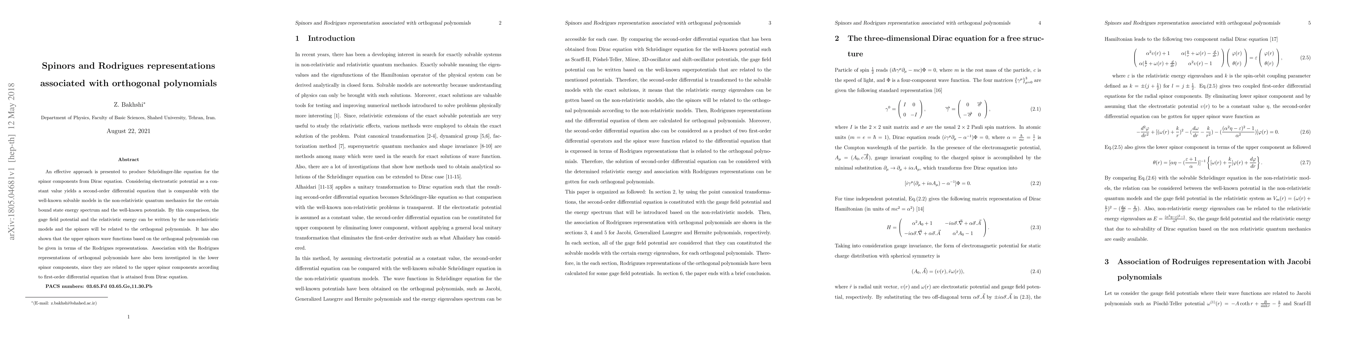 An effective approach is presented to produce Schrodinger-like equation for the spinor components from Dirac equation. Considering electrostatic potential as a constant value yields a second-order differential equation that is comparable with the well-known solvable models in the non-relativistic quantum mechanics for the certain bound state energy spectrum and the well-known potentials. By this comparison, the gage field potential and the relativistic energy can be written by the non-relativistic models and the spinors will be related to the orthogonal polynomials. It has also shown that the upper spinors wave functions based on the orthogonal polynomials can be given in terms of the Rodrigues representations. Association with the Rodrigues representations of orthogonal polynomials have also been investigated in the lower spinor components, since they are related to the upper spinor components according to first-order differential equation that is attained from Dirac equation.