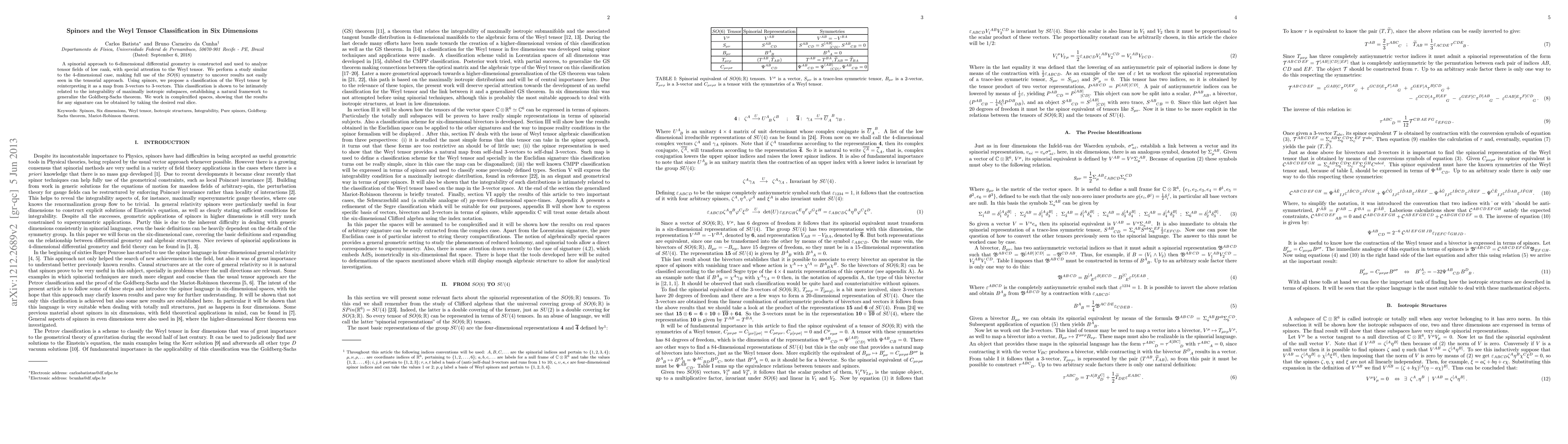 This paper constructs a spinorial approach to 6-dimensional differential geometry to classify the Weyl tensor, leveraging the SO(6) symmetry for insights not easily obtained through tensorial methods. It reinterprets the Weyl tensor as a map from 3-vectors to 3-vectors, establishing a framework to generalize the Goldberg-Sachs theorem and linking it to the integrability of maximally isotropic subspaces.