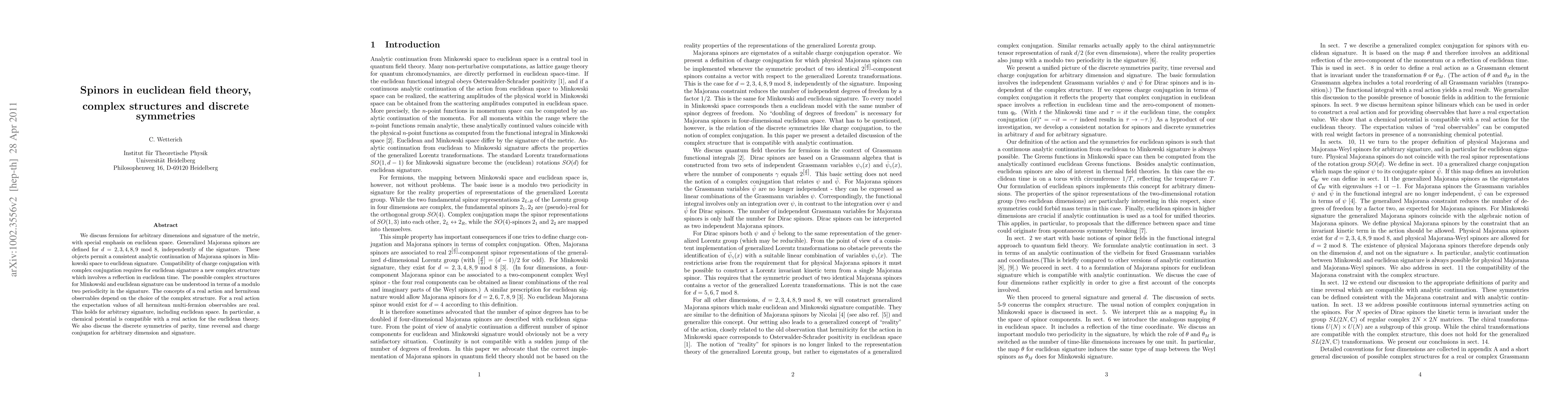 We discuss fermions for arbitrary dimensions and signature of the metric, with special emphasis on euclidean space. Generalized Majorana spinors are defined for $d=2,3,4,8,9$ mod 8, independently of the signature. These objects permit a consistent analytic continuation of Majorana spinors in Min-kowski space to euclidean signature. Compatibility of charge conjugation with complex conjugation requires for euclidean signature a new complex structure which involves a reflection in euclidean time. The possible complex structures for Minkowski and euclidean signature can be understood in terms of a modulo two periodicity in the signature. The concepts of a real action and hermitean observables depend on the choice of the complex structure. For a real action the expectation values of all hermitean multi-fermion observables are real. This holds for arbitrary signature, including euclidean space. In particular, a chemical potential is compatible with a real action for the euclidean theory. We also discuss the discrete symmetries of parity, time reversal and charge conjugation for arbitrary dimension and signature.