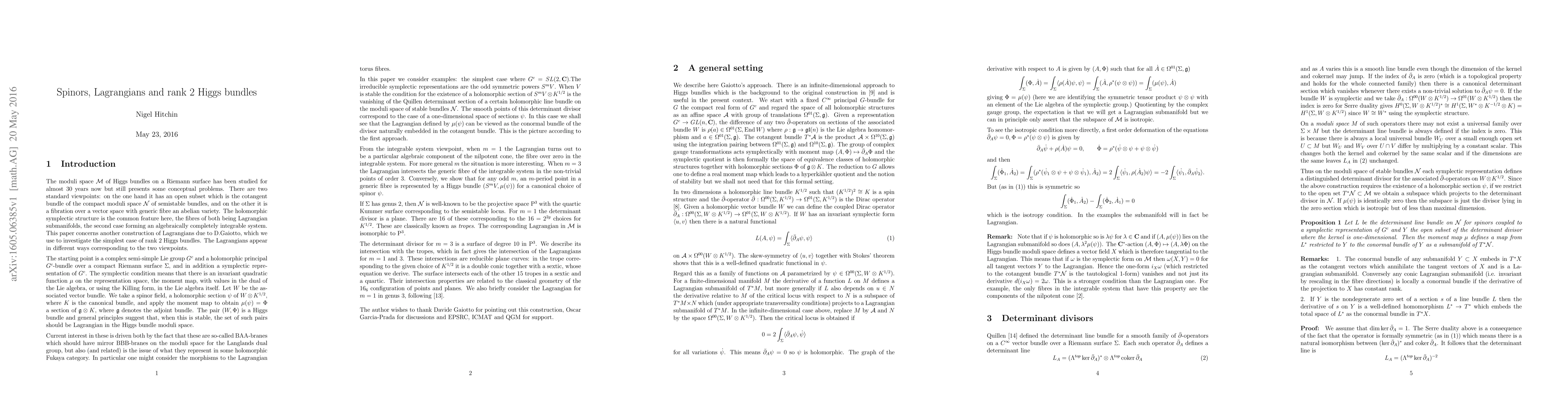 The paper considers the Dirac operator on a Riemann surface coupled to a symplectic holomorphic vector bundle W. Each spinor in the null-space generates through the moment map a Higgs bundle, and varying W one obtains a holomorphic Lagrangian subvariety in the moduli space of Higgs bundles. Applying this to the irreducible symplectic representations of SL(2) we obtain Lagrangian submanifolds of the rank 2 moduli space which link up with m-period points on the Prym variety of the spectral curve as well as Brill-Noether loci on the moduli space of semistable bundles. The case of genus 2 is investigated in some detail.