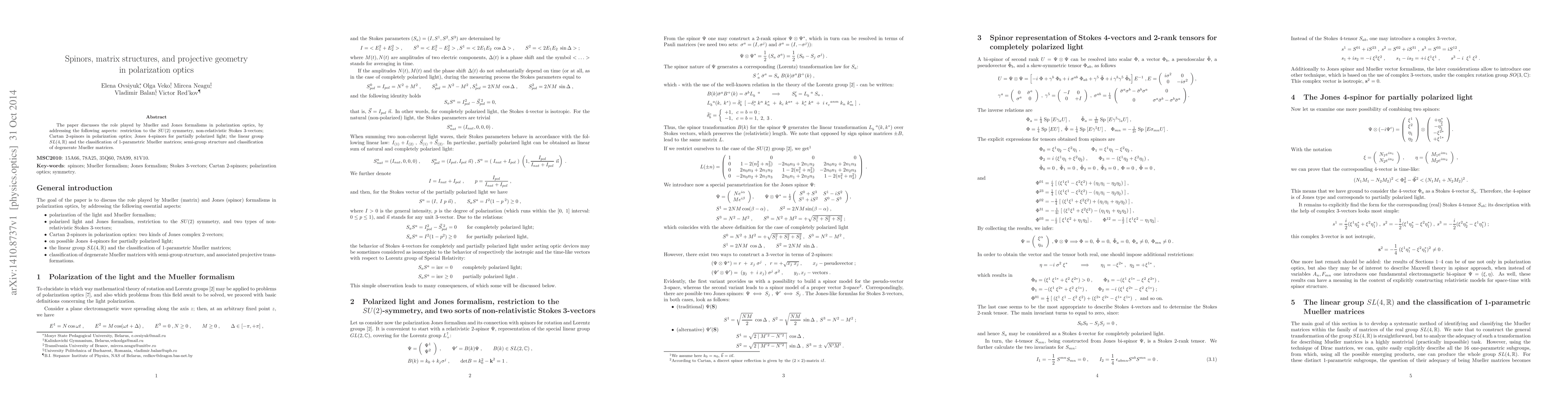 The paper discusses the role played by Mueller and Jones formalisms in polarization optics, by addressing the following aspects: restriction to the SU(2) symmetry, non-relativistic Stokes 3-vectors; Cartan 2-spinors in polarization optics; Jones 4-spinors for partially polarized light; the linear group SL(4,R) and the classification of 1-parametric Mueller matrices; semi-group structure and classification of degenerate Mueller matrices.