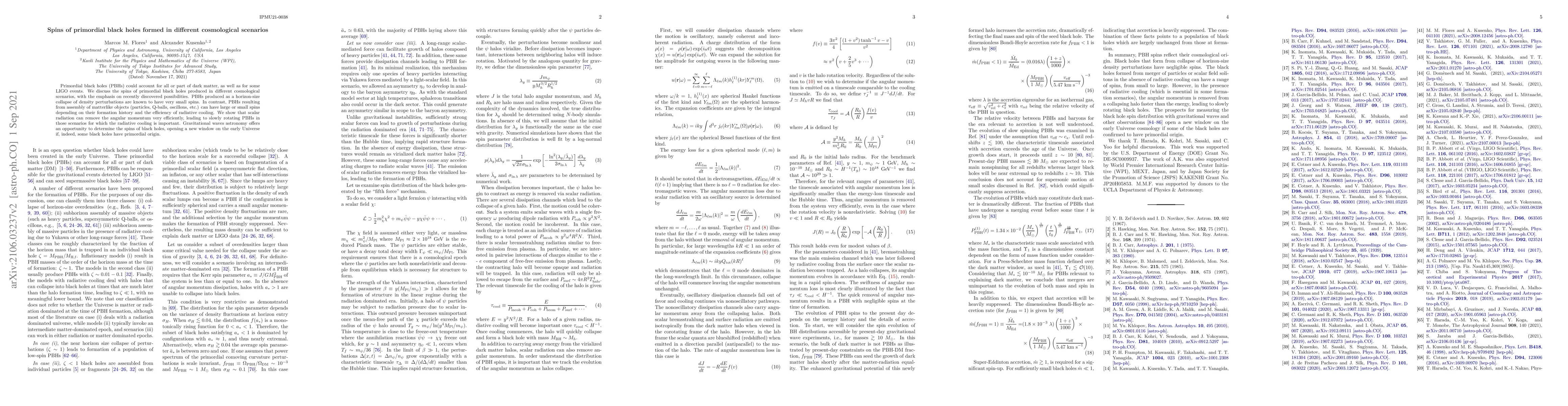 Primordial black holes (PBHs) could account for all or part of dark matter, as well as for some LIGO events. We discuss the spins of primordial black holes produced in different cosmological scenarios, with the emphasis on recently discovered possibilities. PBHs produced as a horizon-size collapse of density perturbations are known to have very small spins. In contrast, PBHs resulting from assembly of matterlike objects (particles, Q-balls, oscillons, etc.) can have large or small spins depending on their formation history and the efficiency of radiative cooling. We show that scalar radiation can remove the angular momentum very efficiently, leading to slowly rotating PBHs in those scenarios for which the radiative cooling is important. Gravitational waves astronomy offers an opportunity to determine the spins of black holes, opening a new window on the early Universe if, indeed, some black holes have primordial origin.
