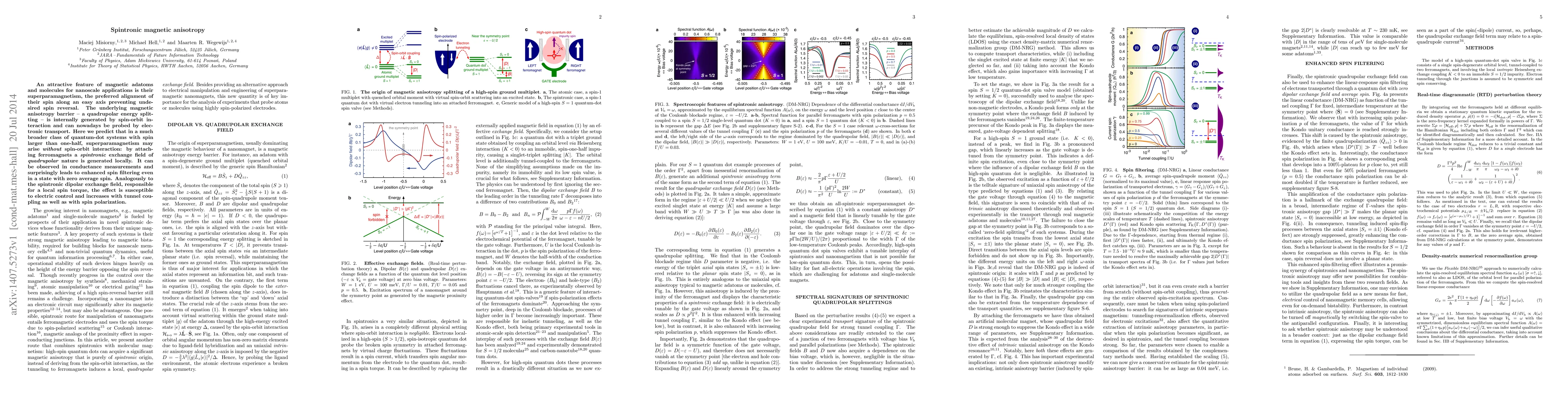 An attractive feature of magnetic adatoms and molecules for nanoscale applications is their superparamagnetism, the preferred alignment of their spin along an easy axis preventing undesired spin reversal. The underlying magnetic anisotropy barrier --a quadrupolar energy splitting-- is internally generated by spin-orbit interaction and can nowadays be probed by electronic transport. Here we predict that in a much broader class of quantum-dot systems with spin larger than one-half, superparamagnetism may arise without spin-orbit interaction: by attaching ferromagnets a spintronic exchange field of quadrupolar nature is generated locally. It can be observed in conductance measurements and surprisingly leads to enhanced spin filtering even in a state with zero average spin. Analogously to the spintronic dipolar exchange field, responsible for a local spin torque, the effect is susceptible to electric control and increases with tunnel coupling as well as with spin polarization.