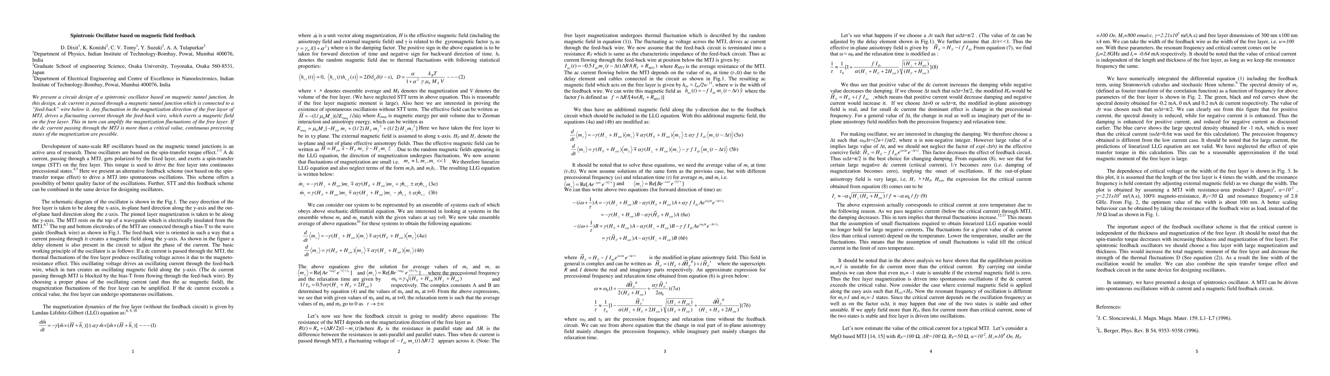 We present a circuit design of a spintronic oscillator based on magnetic tunnel junction. In this design, a dc current is passed through a magnetic tunnel junction which is connected to a feed-back wire below it. Any fluctuation in the magnetization direction of the free layer of MTJ, drives a fluctuating current through the feed-back wire, which exerts a magnetic field on the free layer. This in turn can amplify the magnetization fluctuations of the free layer. If the dc current passing through the MTJ is more than a critical value, continuous precessing states of the magnetization are possible.