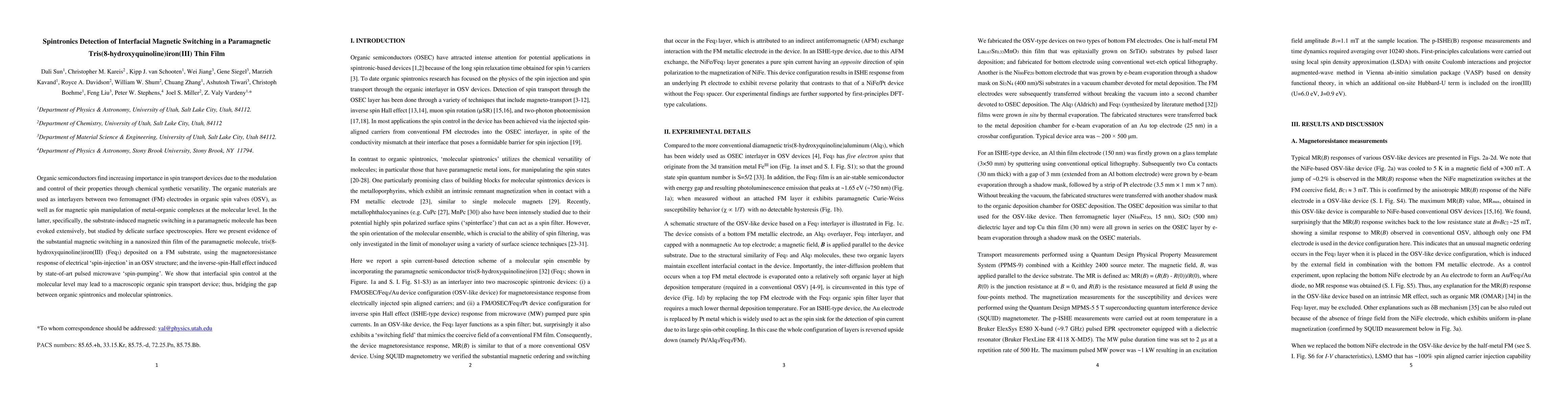 This paper demonstrates the detection of magnetic switching in a thin film of paramagnetic tris(8-hydroxyquinoline)iron(III) using spintronics techniques in an organic spin valve structure. The study highlights the potential for macroscopic organic spin transport devices through molecular-level spin control.