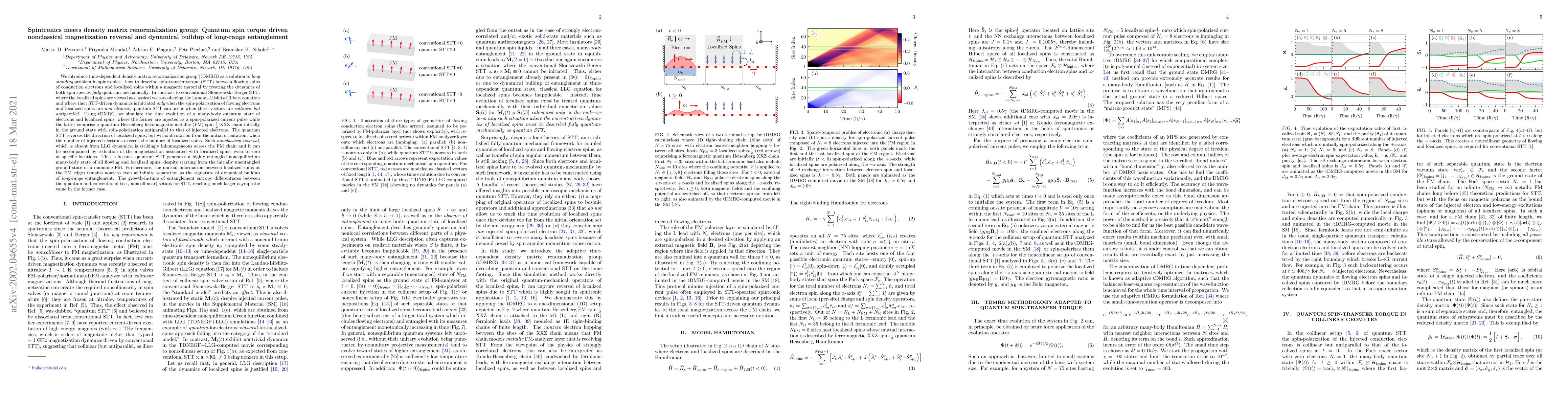 This paper introduces the time-dependent density matrix renormalization group (tDMRG) to simulate quantum spin-transfer torque (STT) dynamics in spintronics, revealing nonclassical magnetization reversal and long-range entanglement formation in quantum Heisenberg ferromagnetic chains.