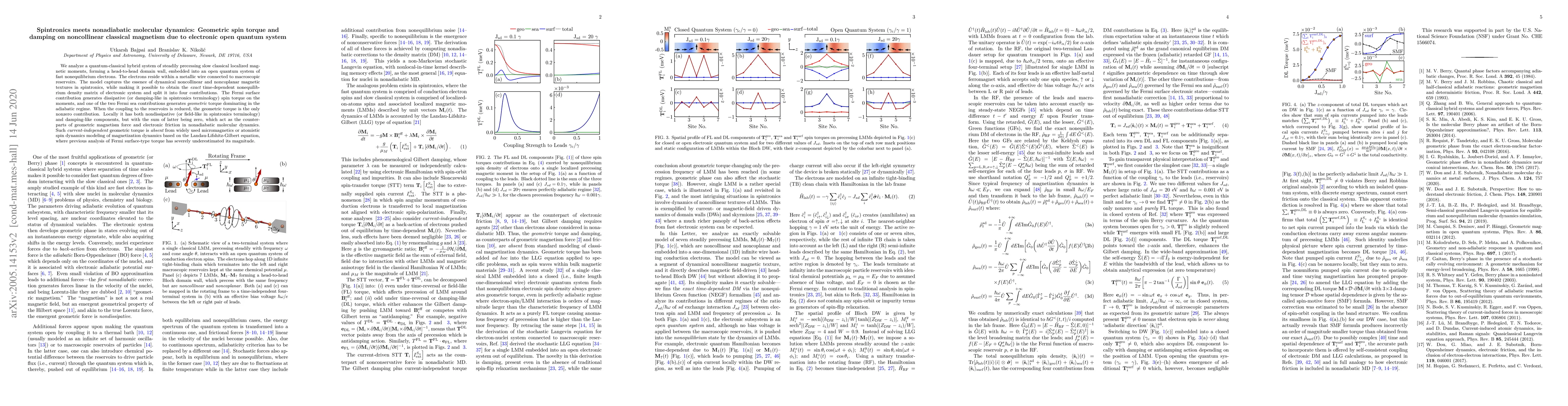 This paper investigates a quantum-classical hybrid system where slow precessing magnetic moments in a domain wall interact with fast nonequilibrium electrons in a metallic wire. It reveals a geometric spin torque and damping effects due to the electronic open quantum system, highlighting a current-independent torque absent in traditional micromagnetics models.